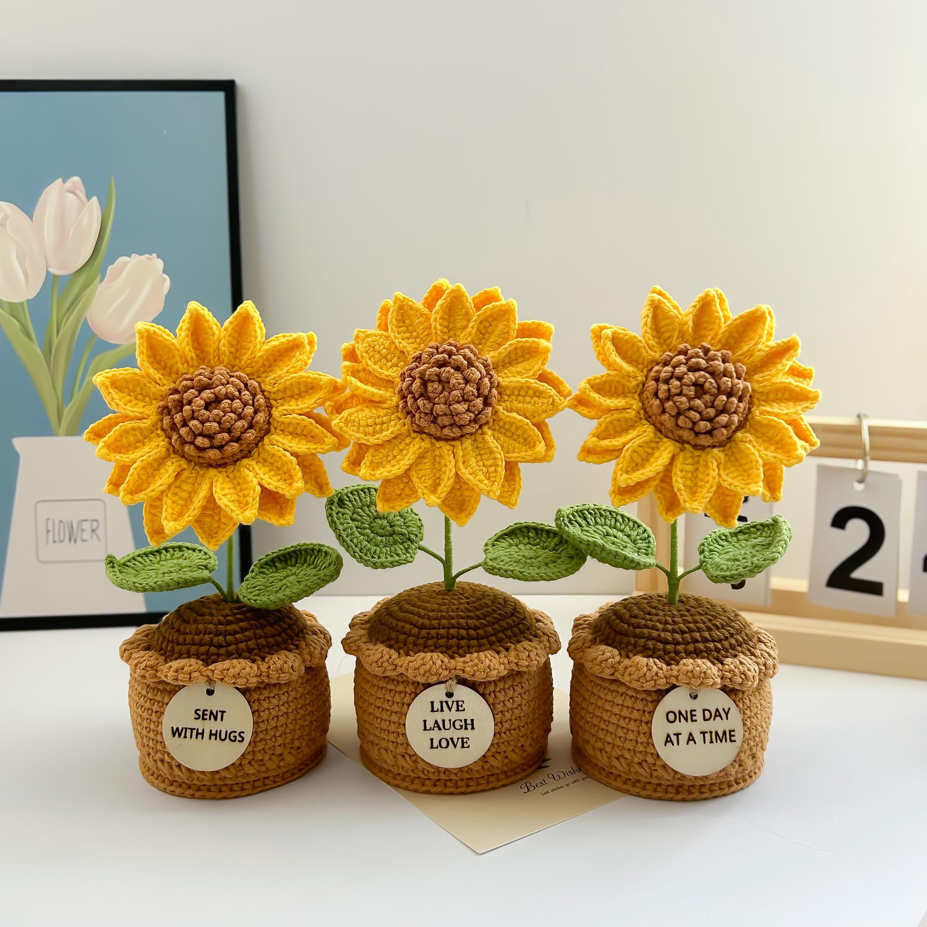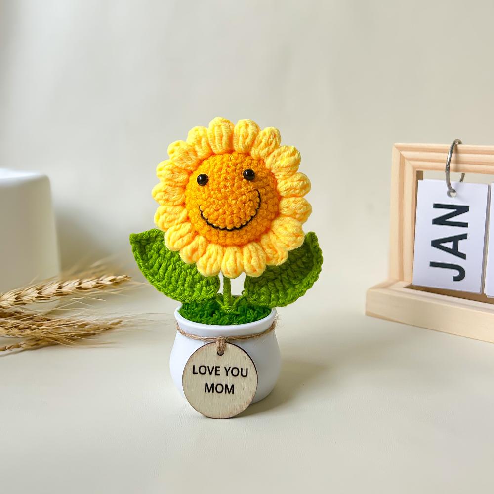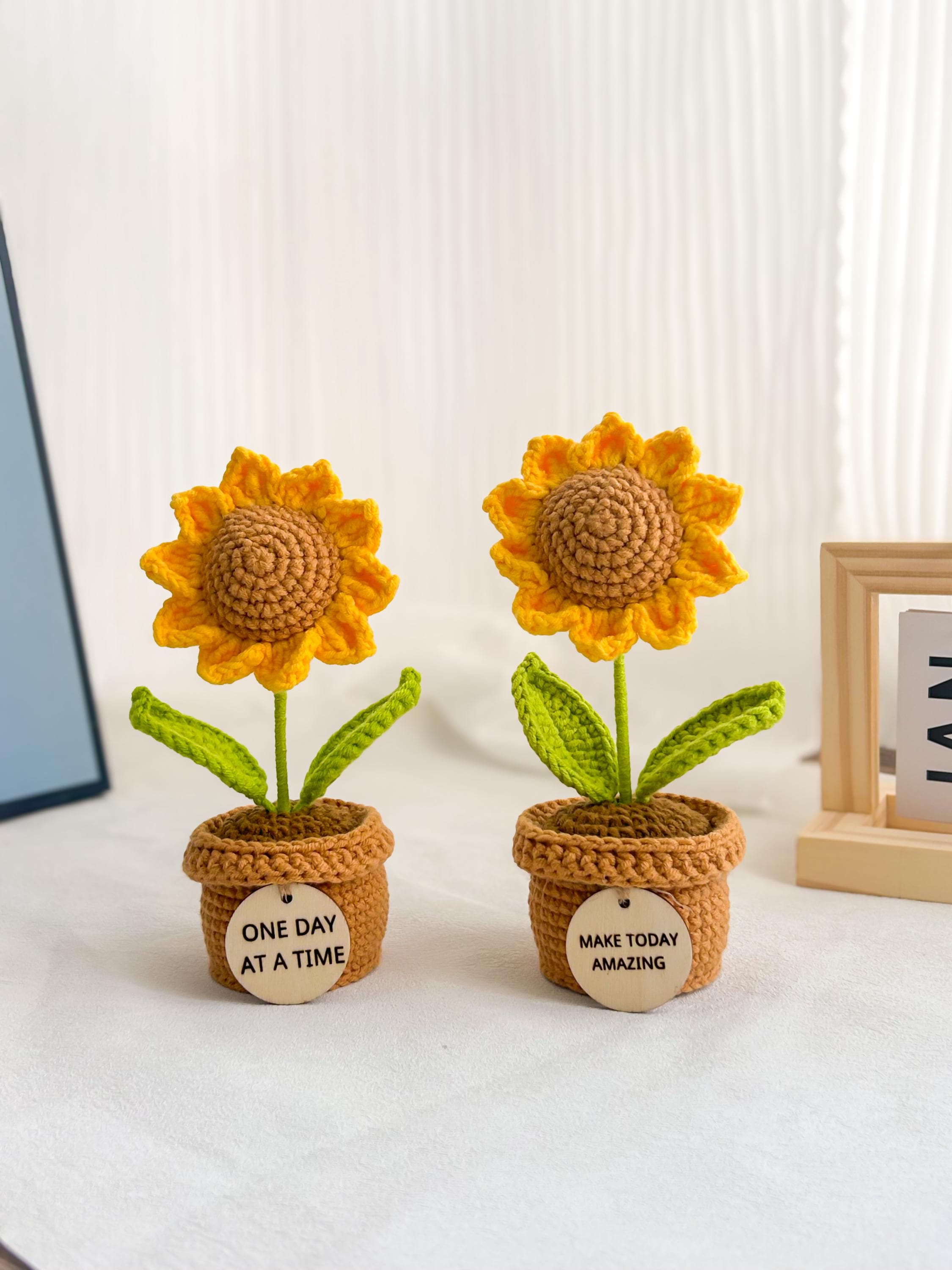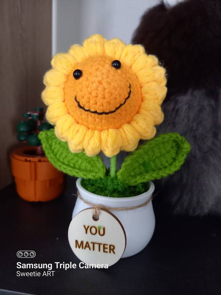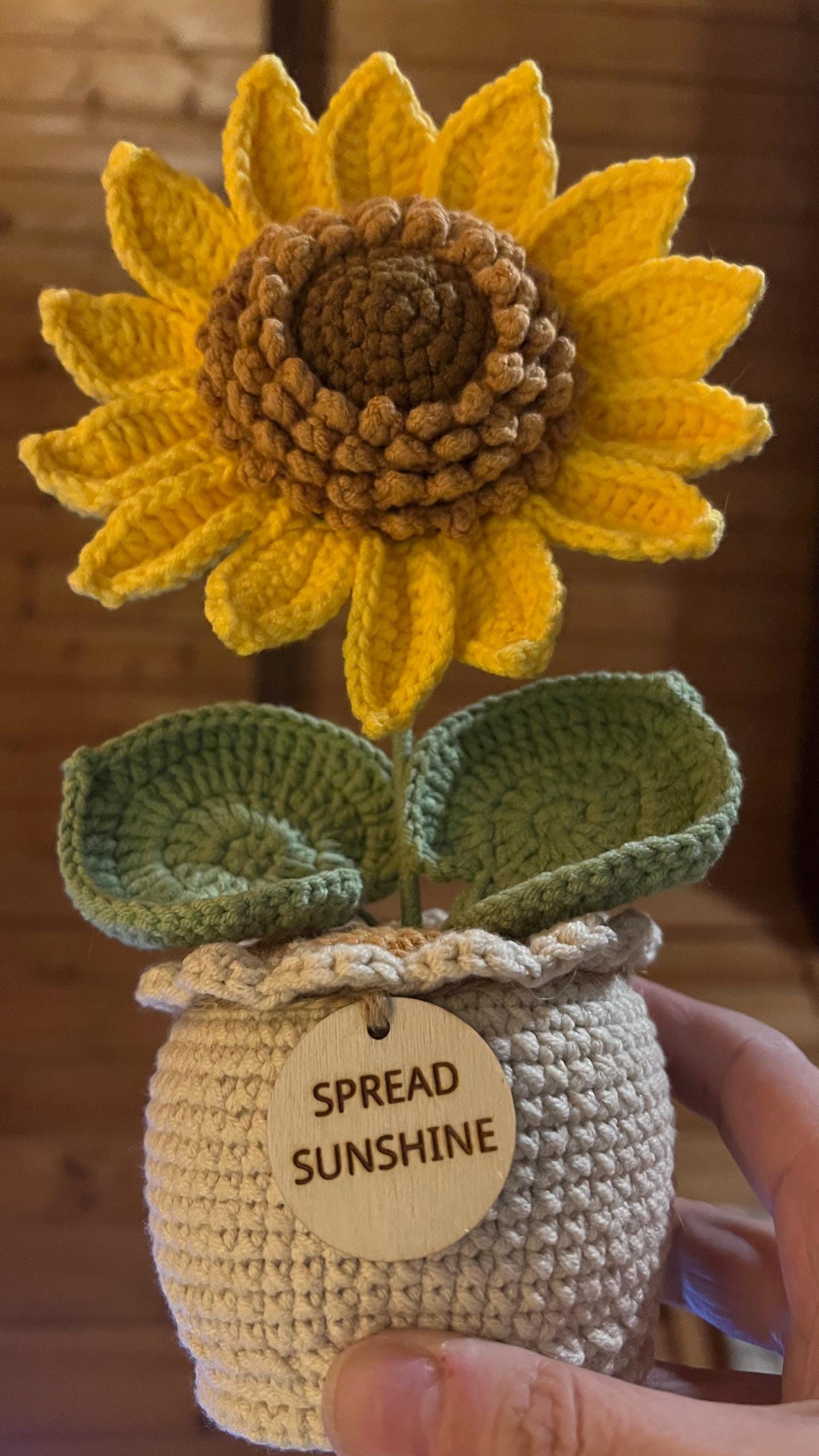 Personalized Touch: Customize your crochet sunflower with an engraved wooden tag, adding a meaningful and uplifting message, perfect for yourself or as a gift.