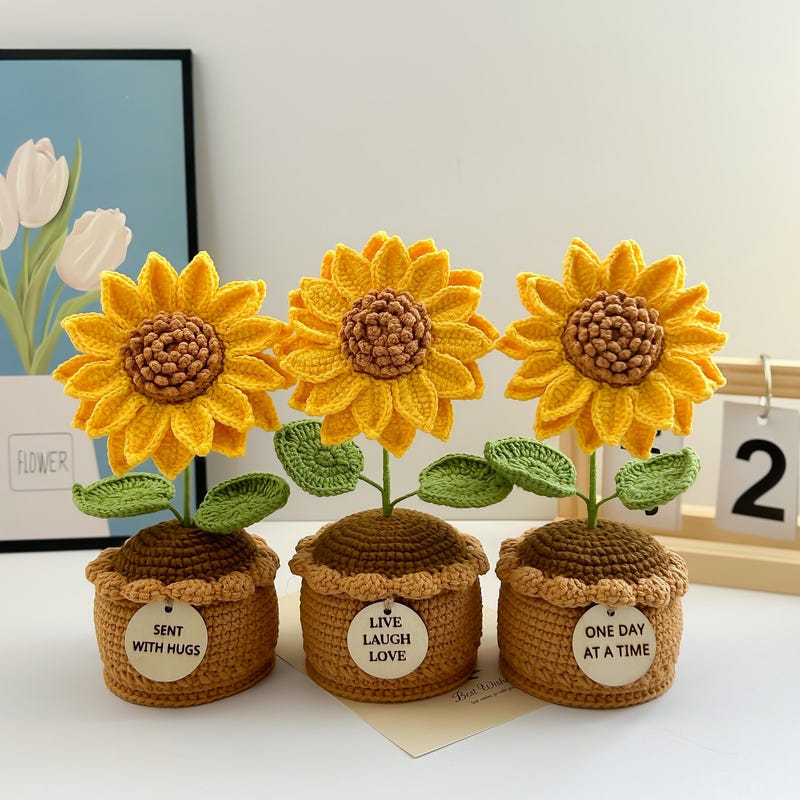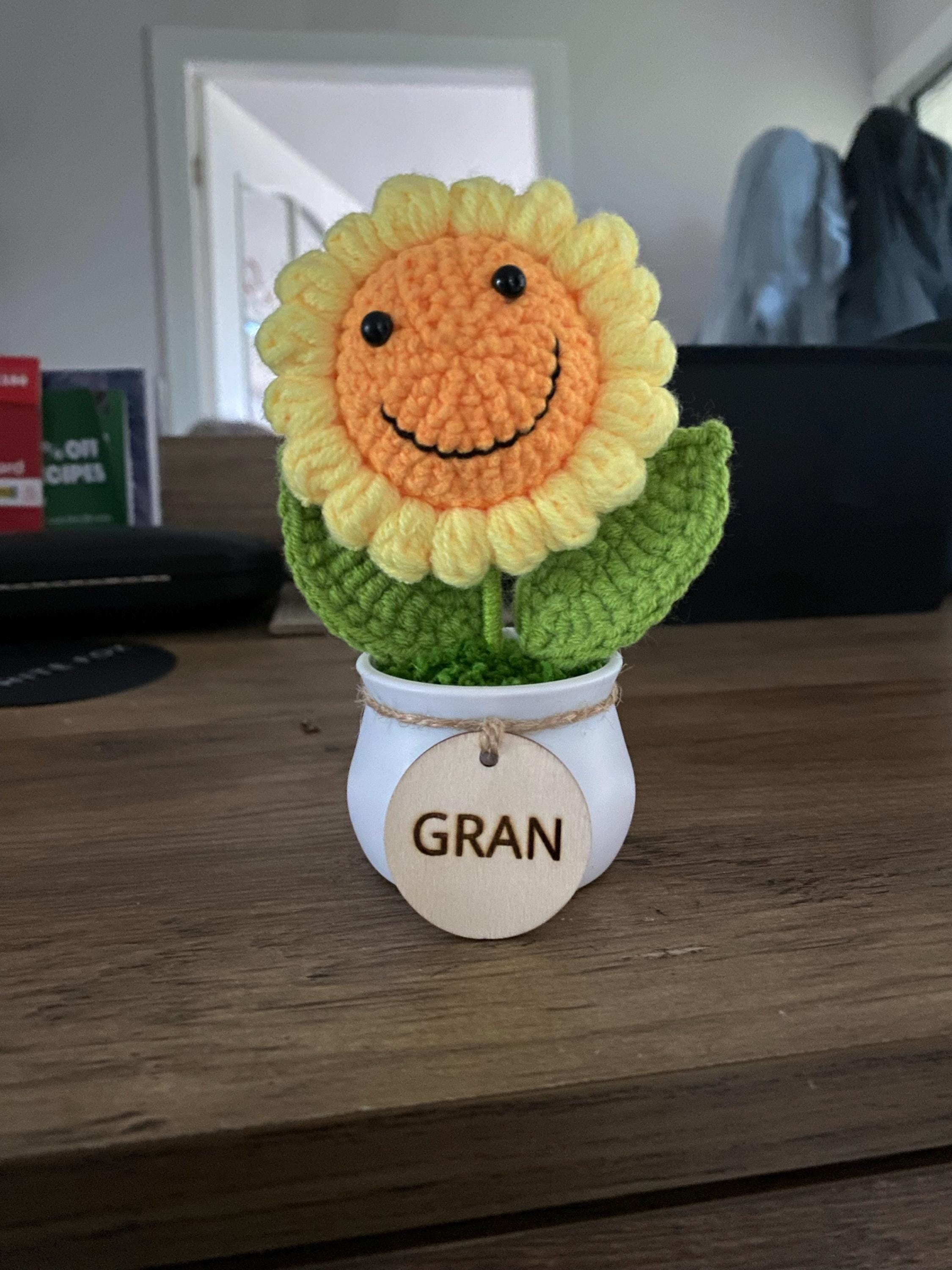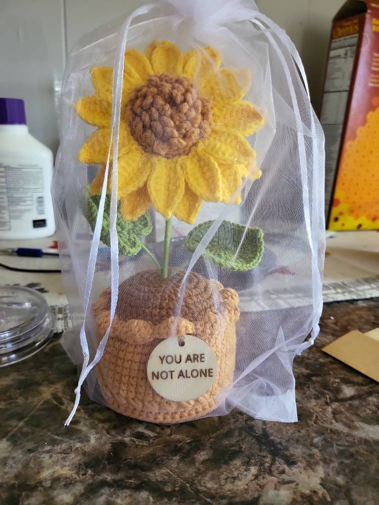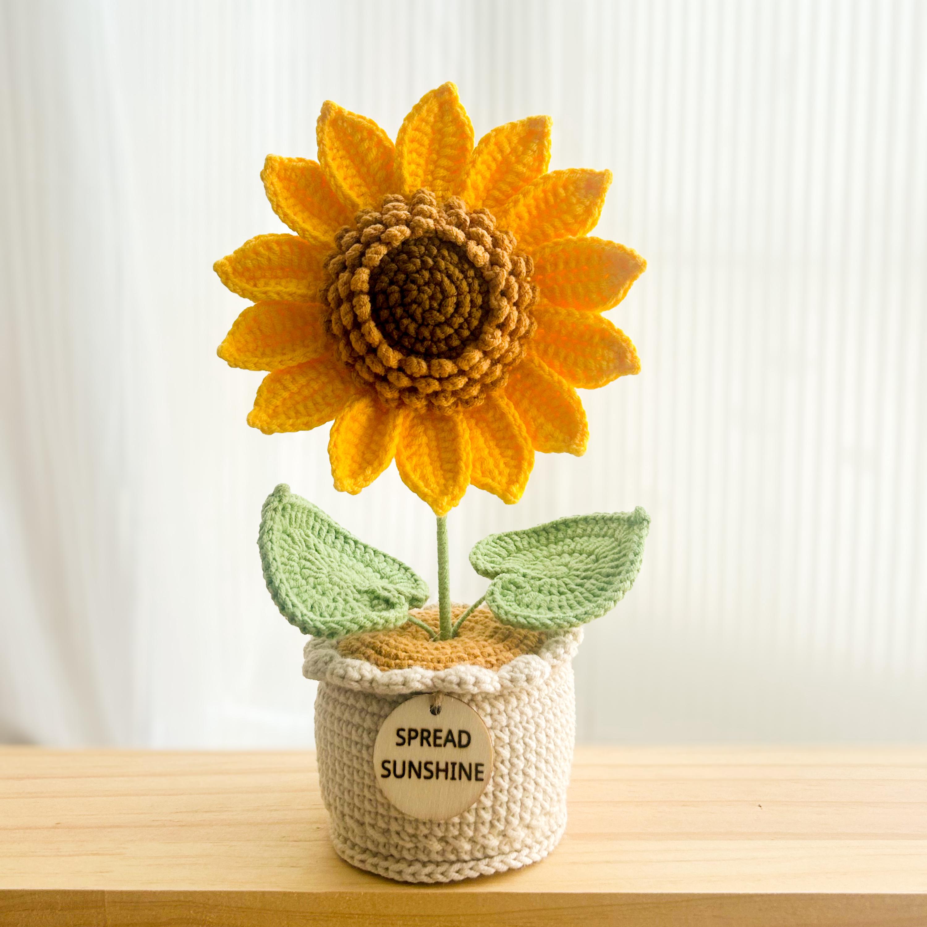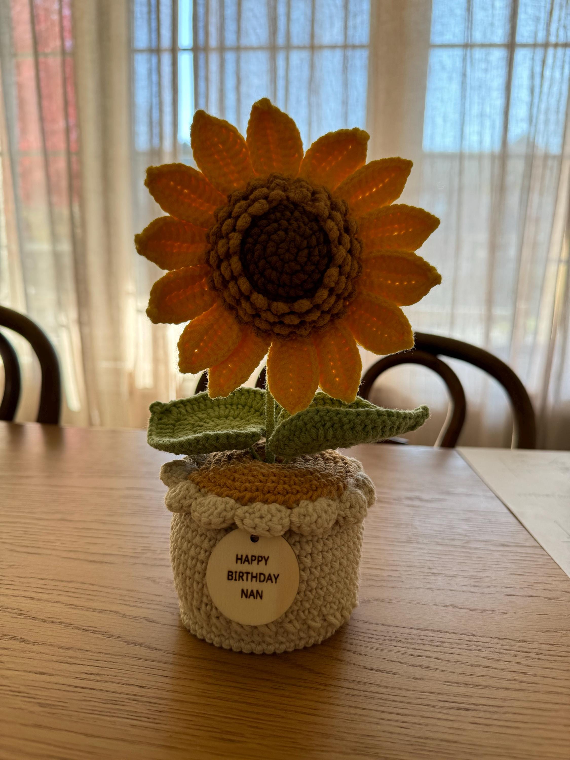 Personalized Touch: Customize your crochet sunflower with an engraved wooden tag, adding a meaningful and uplifting message, perfect for yourself or as a gift.