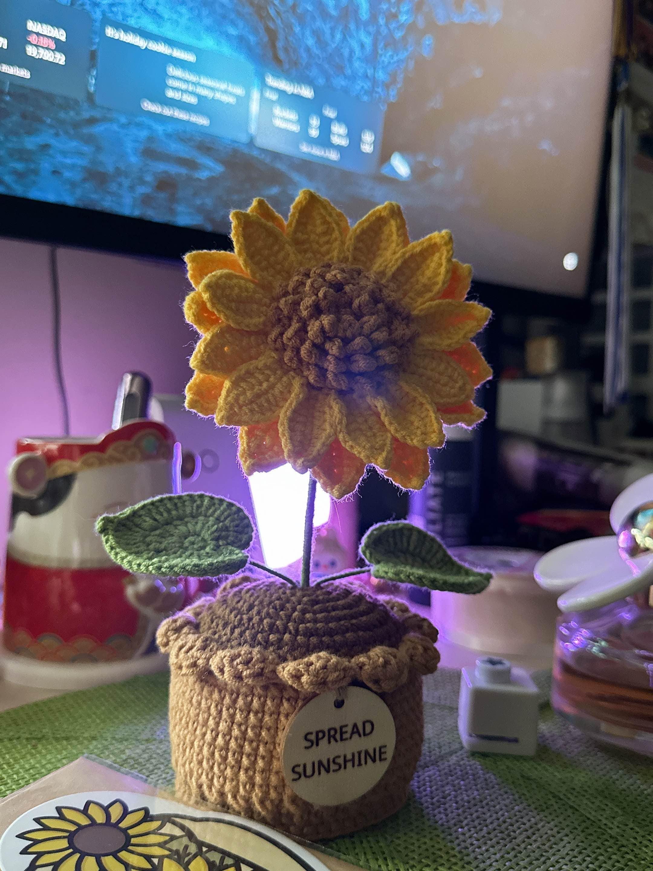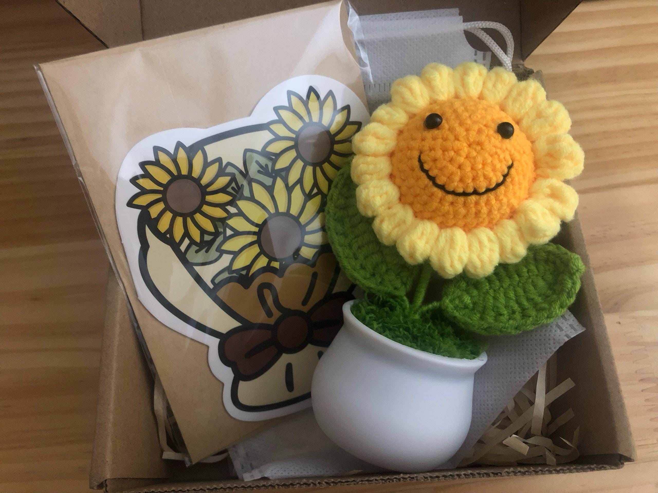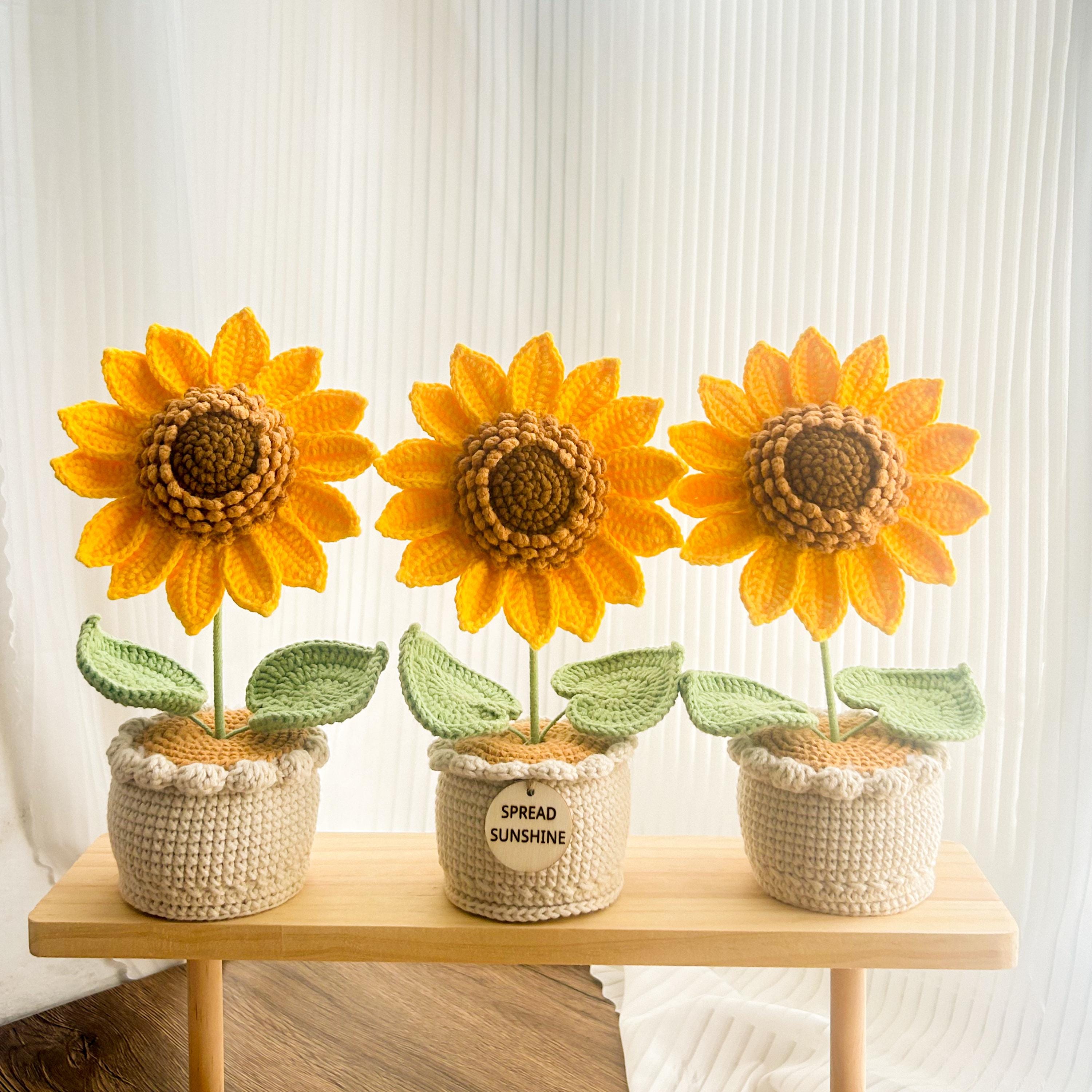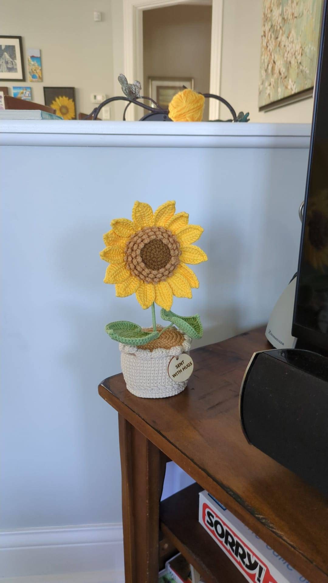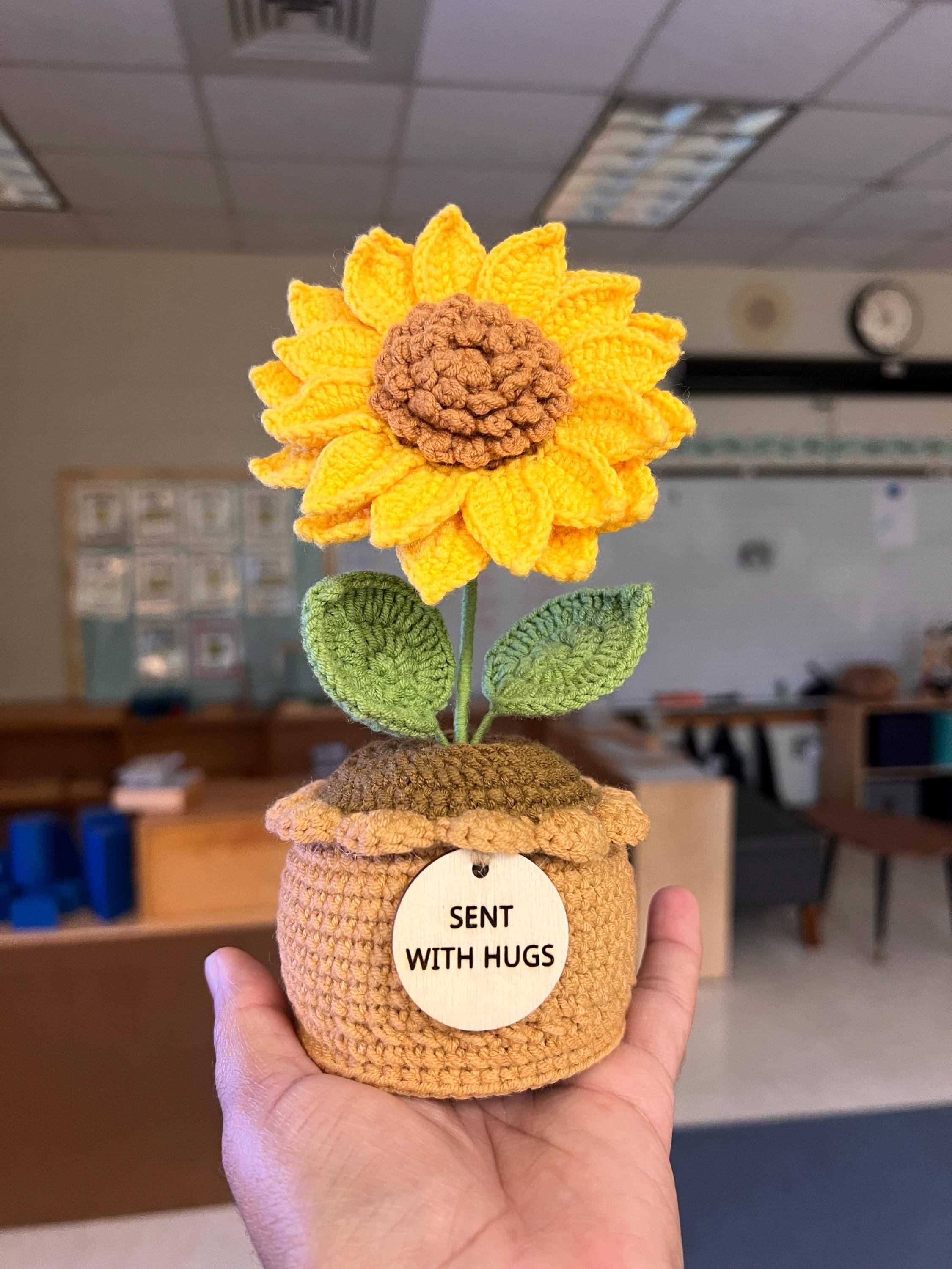 Personalized Touch: Customize your crochet sunflower with an engraved wooden tag, adding a meaningful and uplifting message, perfect for yourself or as a gift.