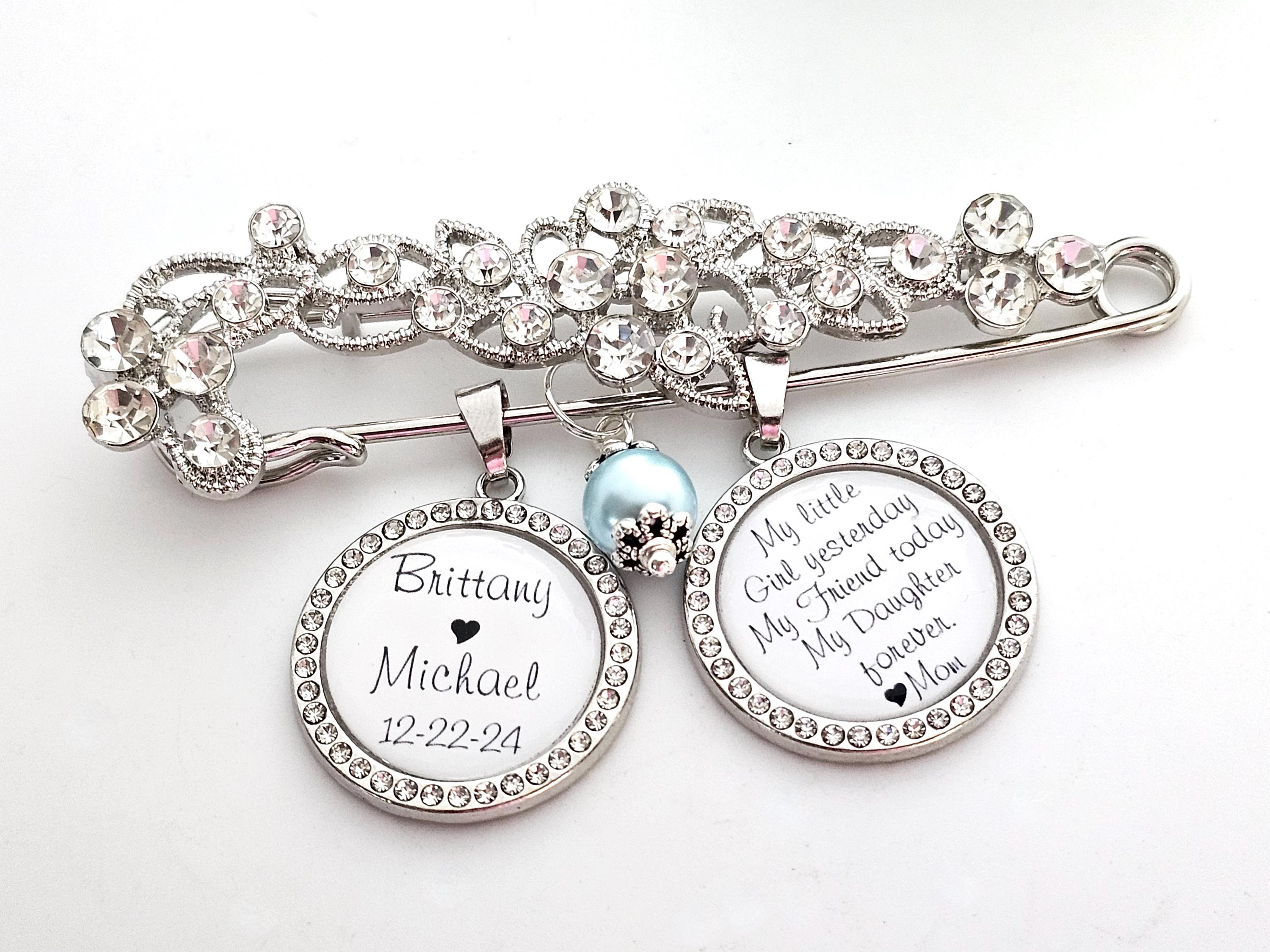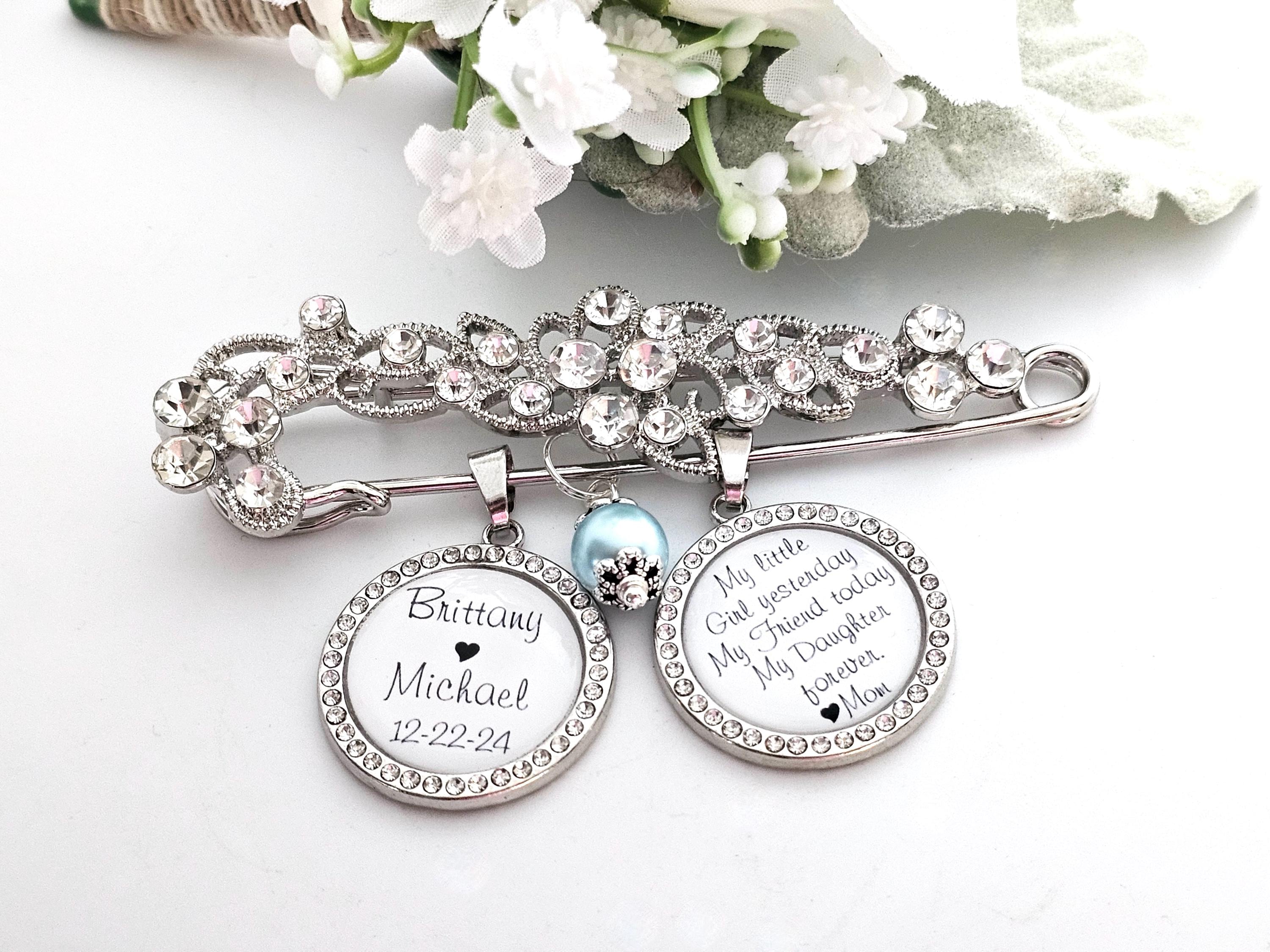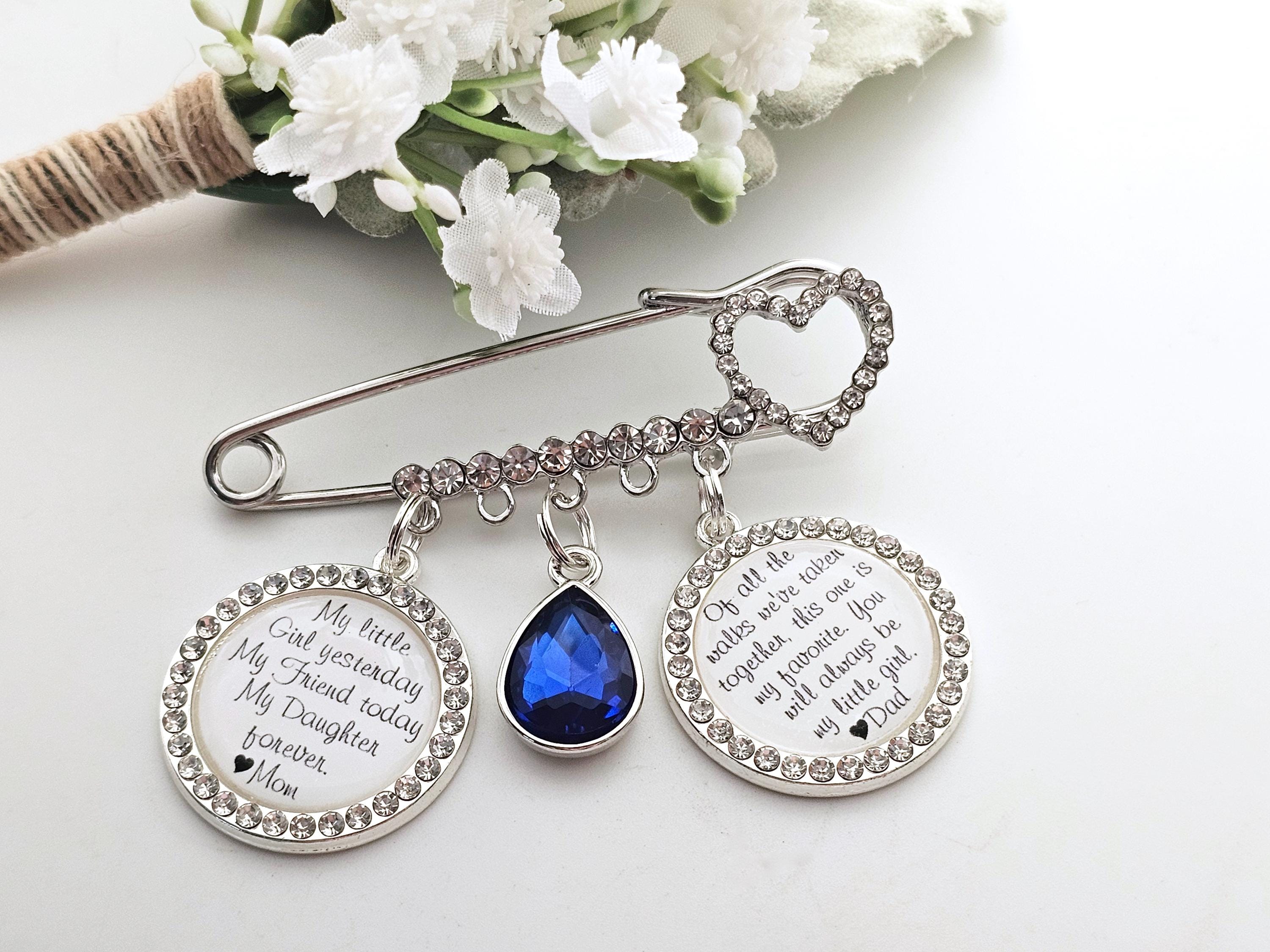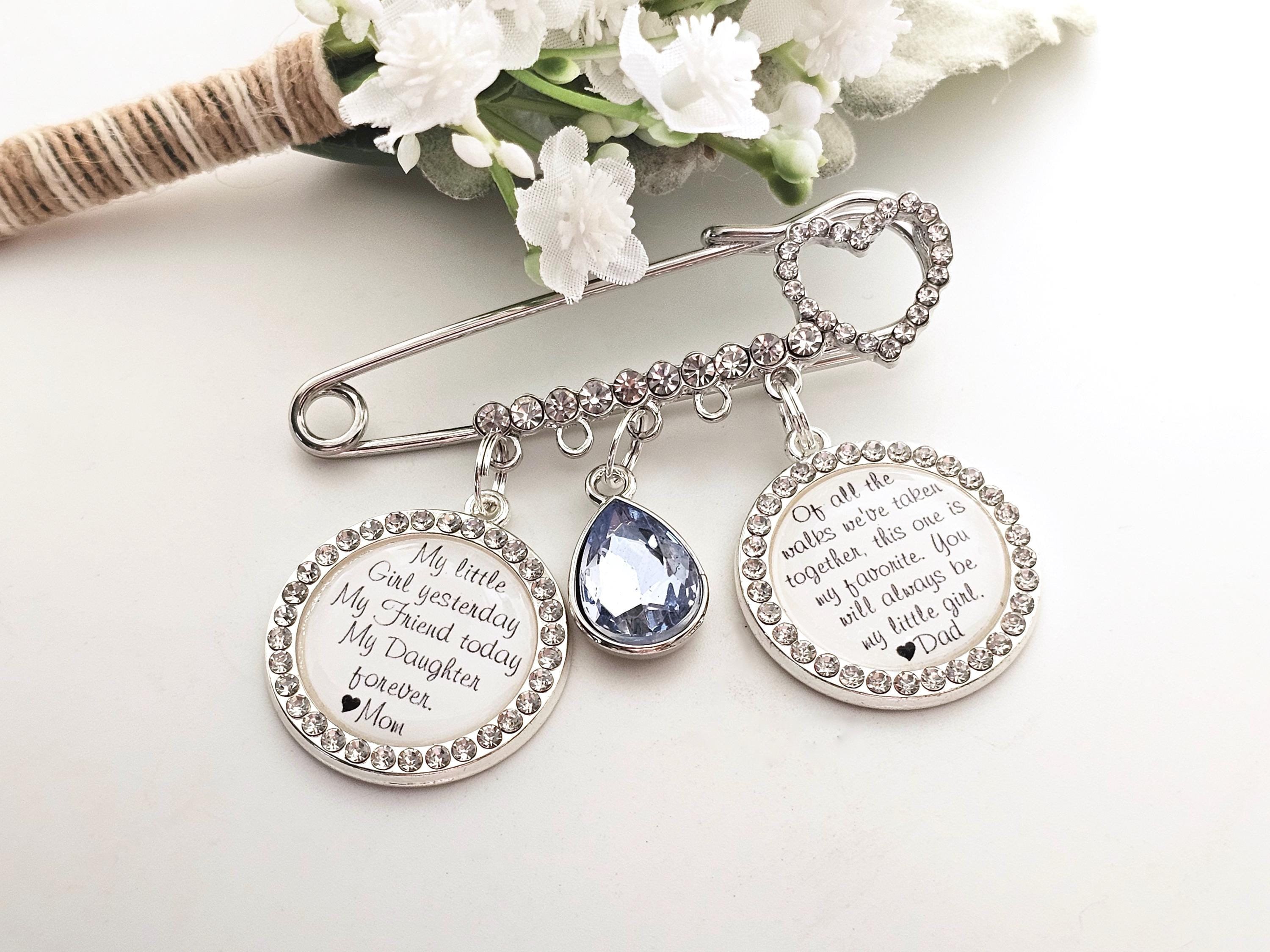 Exquisite bridal wedding pin with a beautiful quote from your mother. Bridal pin for the bride - a wedding tradition, can be used as a bridal bouquet pendant or garter.