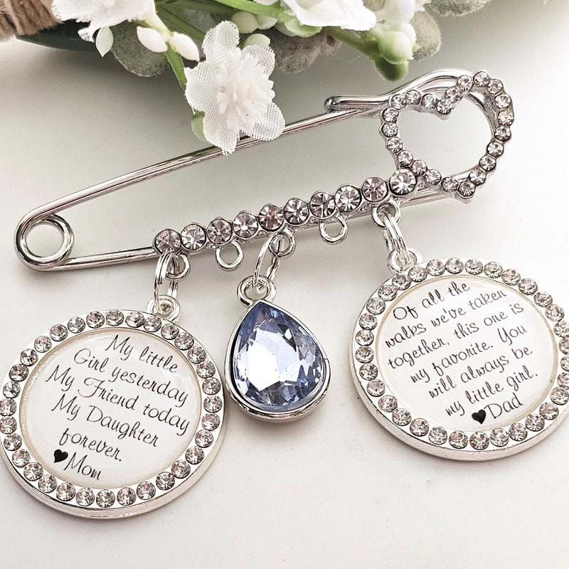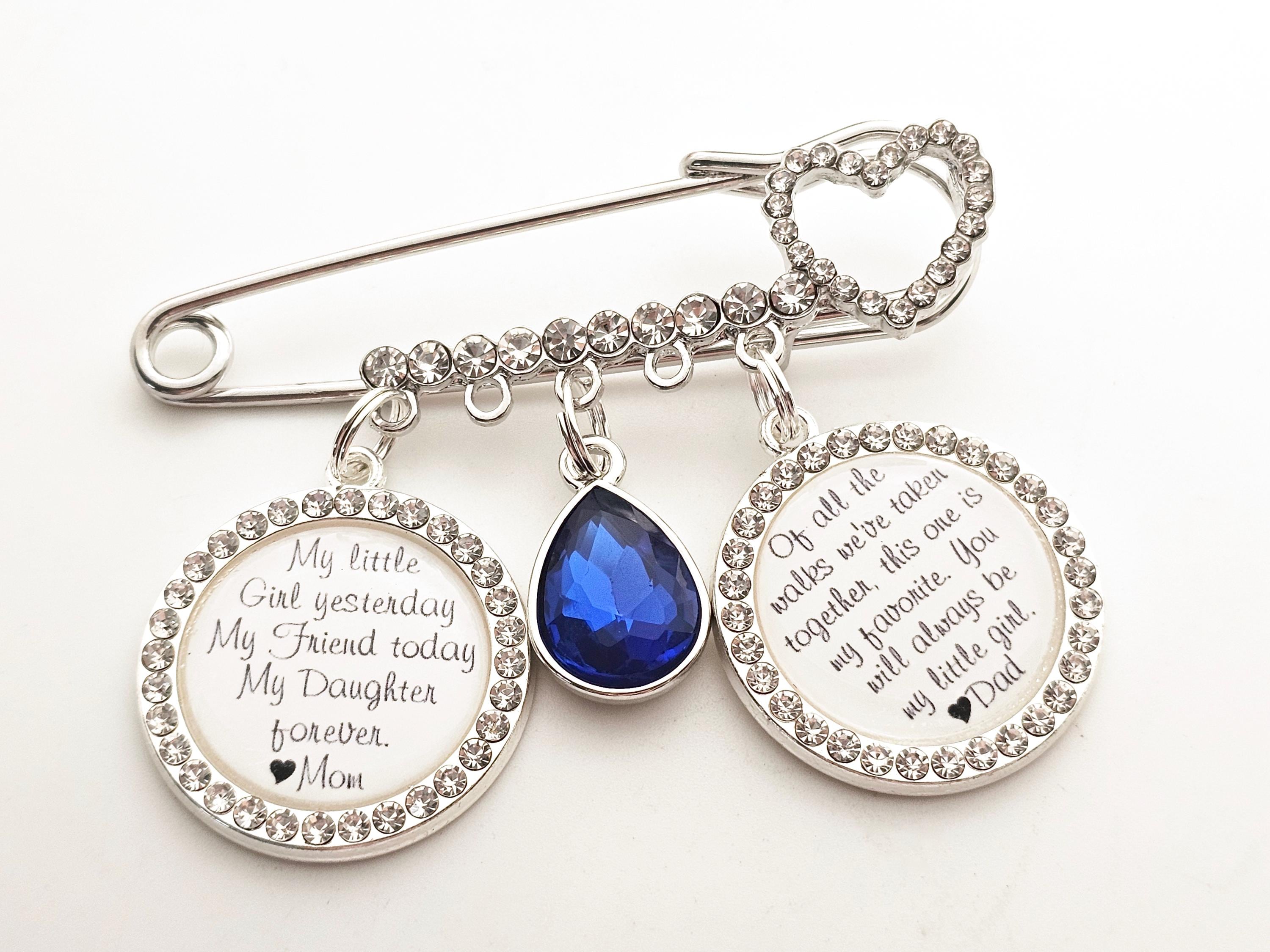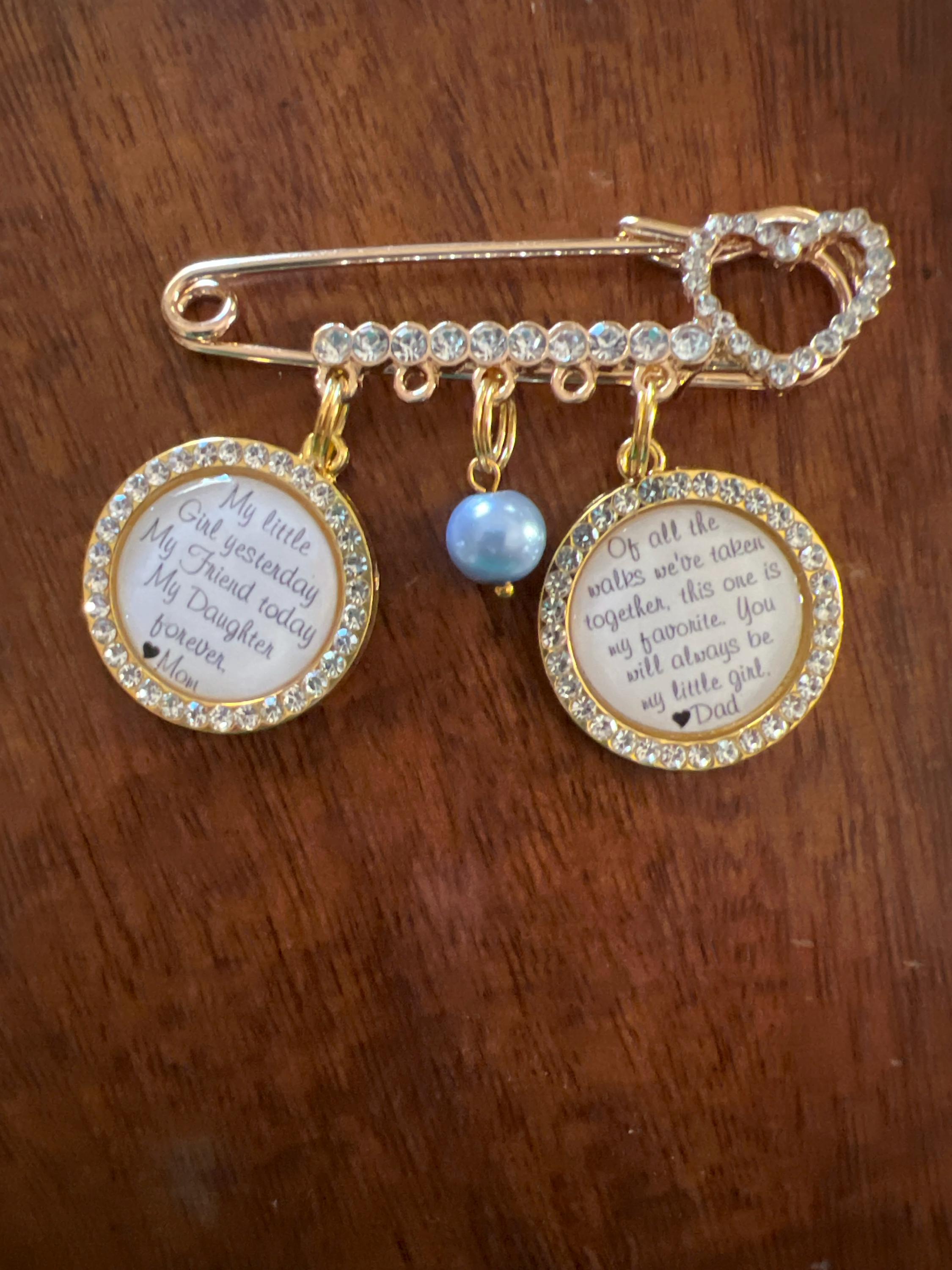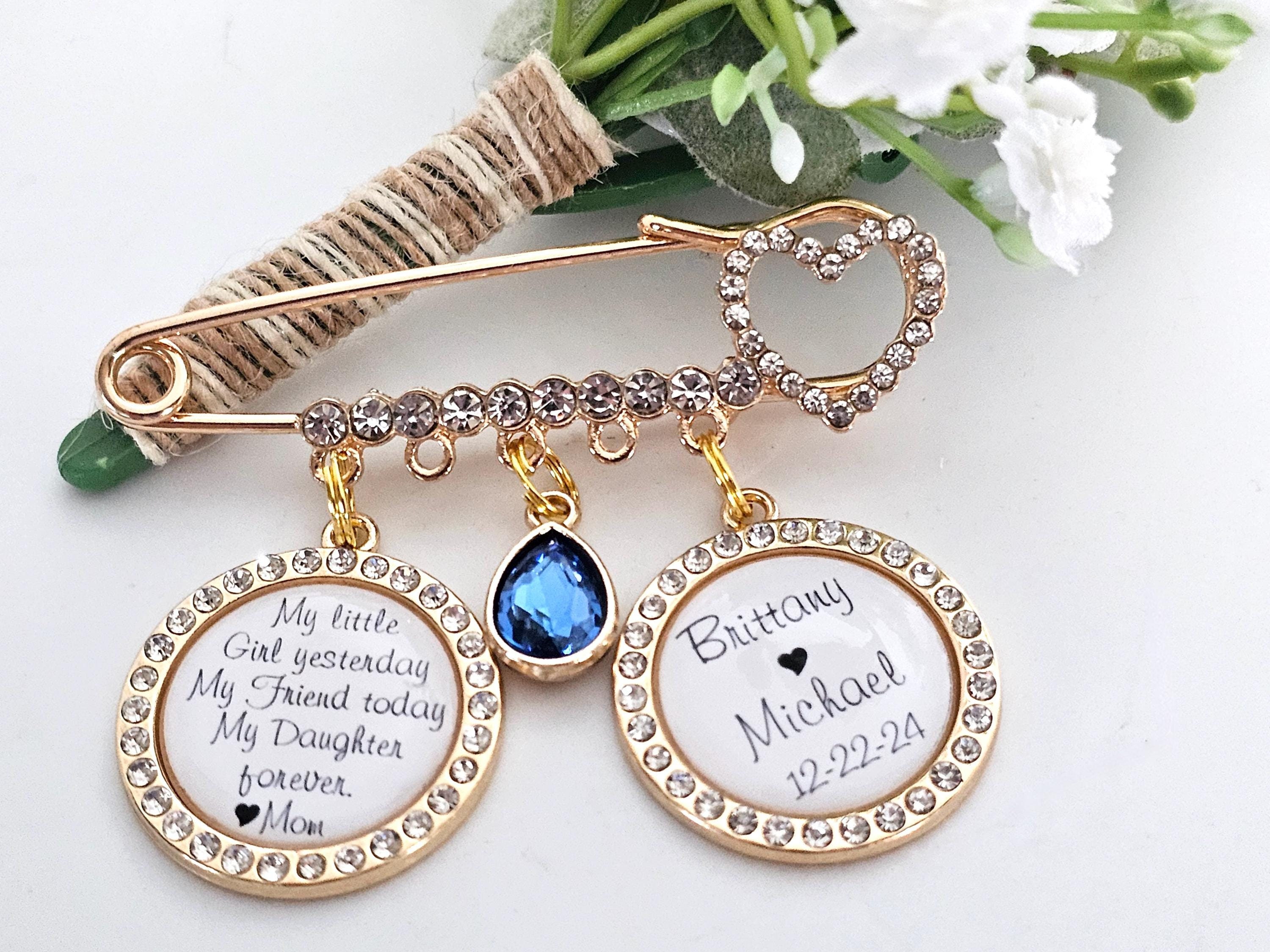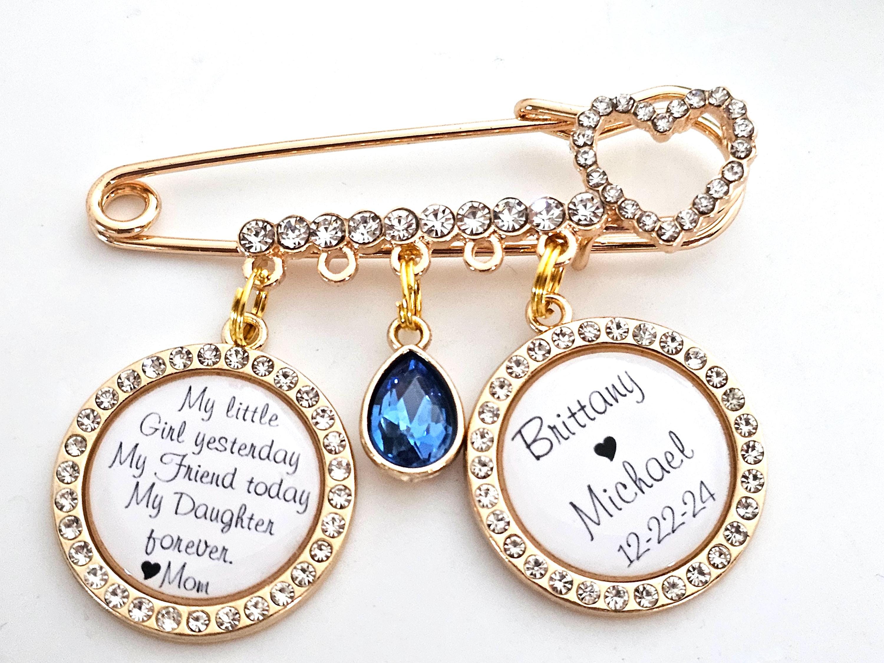 Exquisite bridal wedding pin with a beautiful quote from your mother. Bridal pin for the bride - a wedding tradition, can be used as a bridal bouquet pendant or garter.