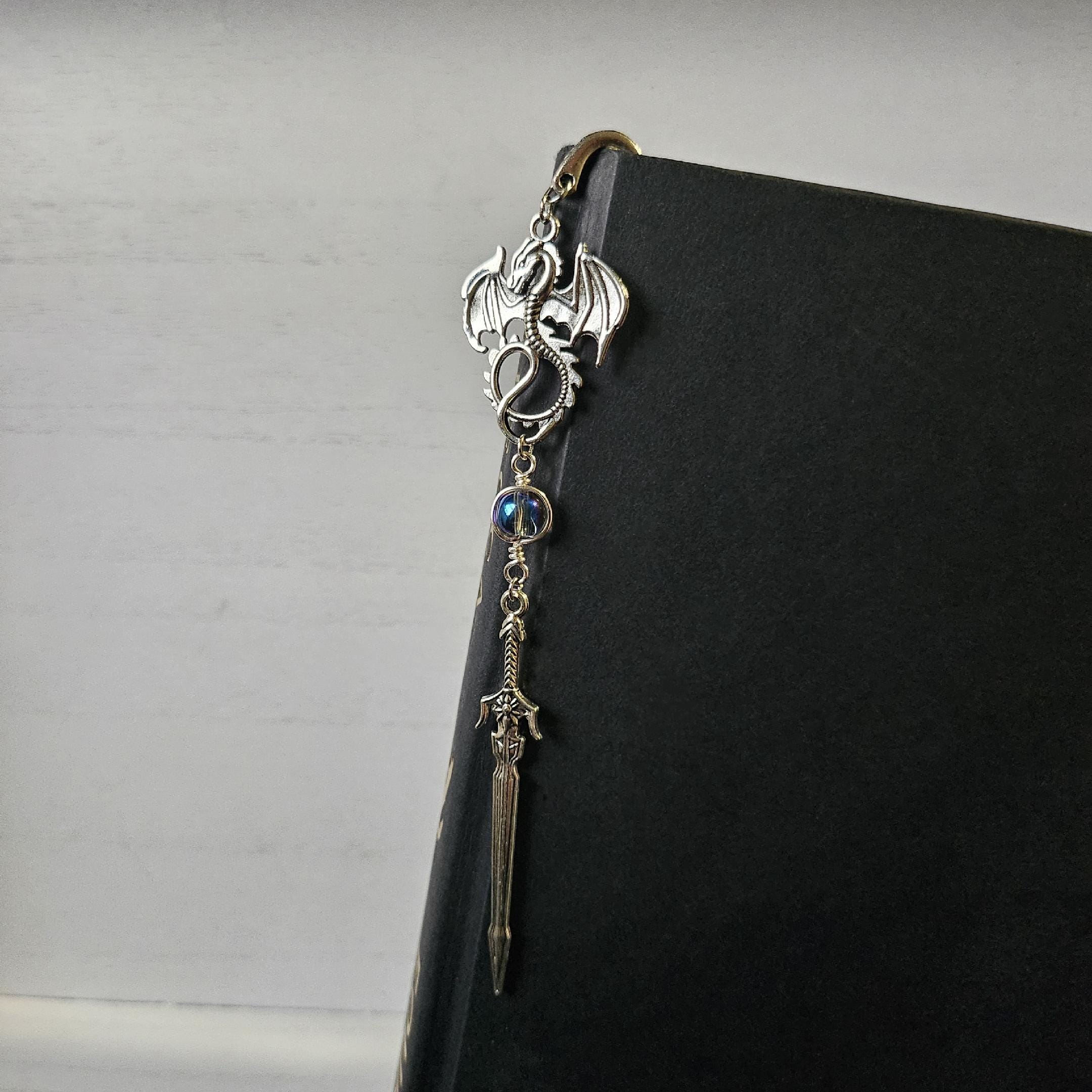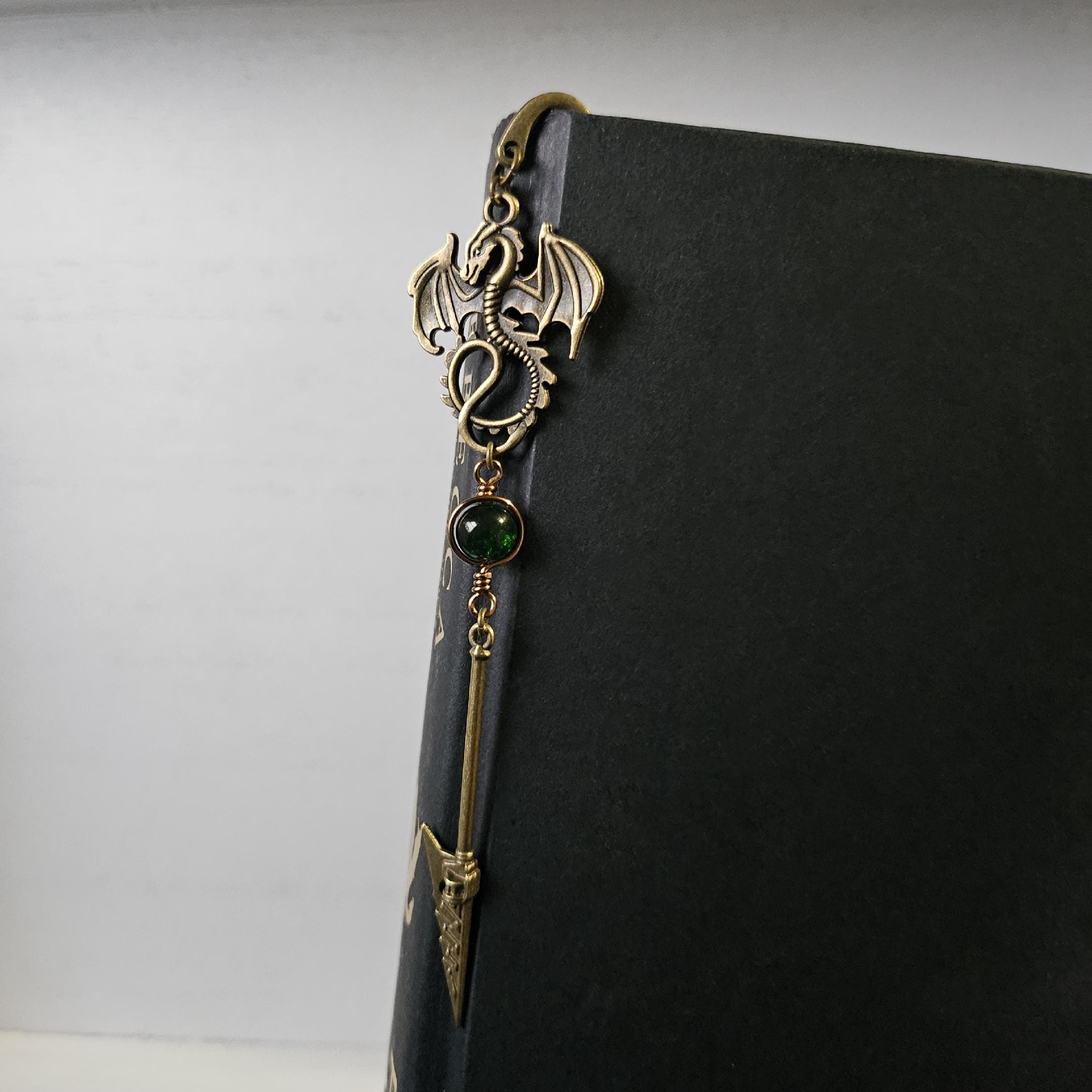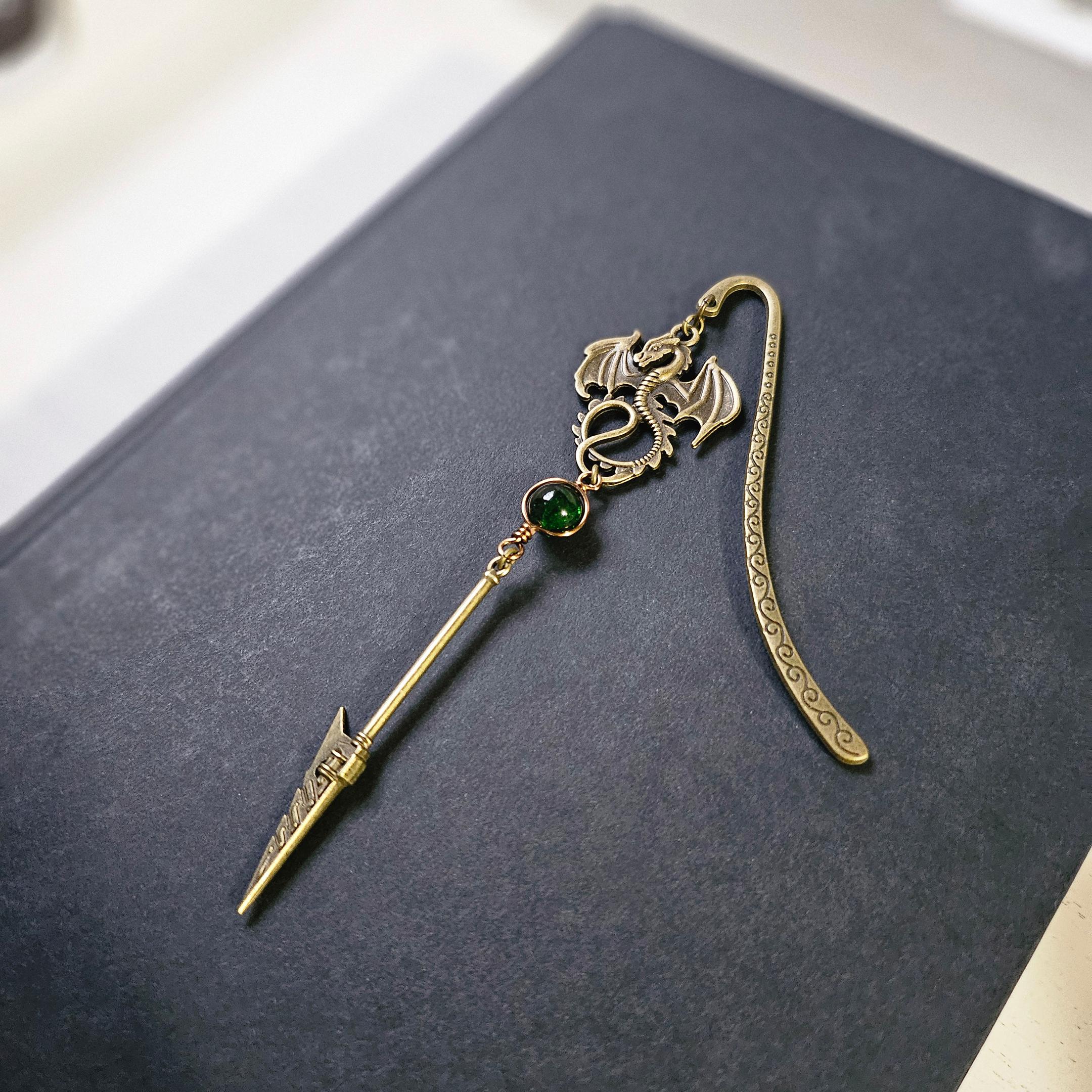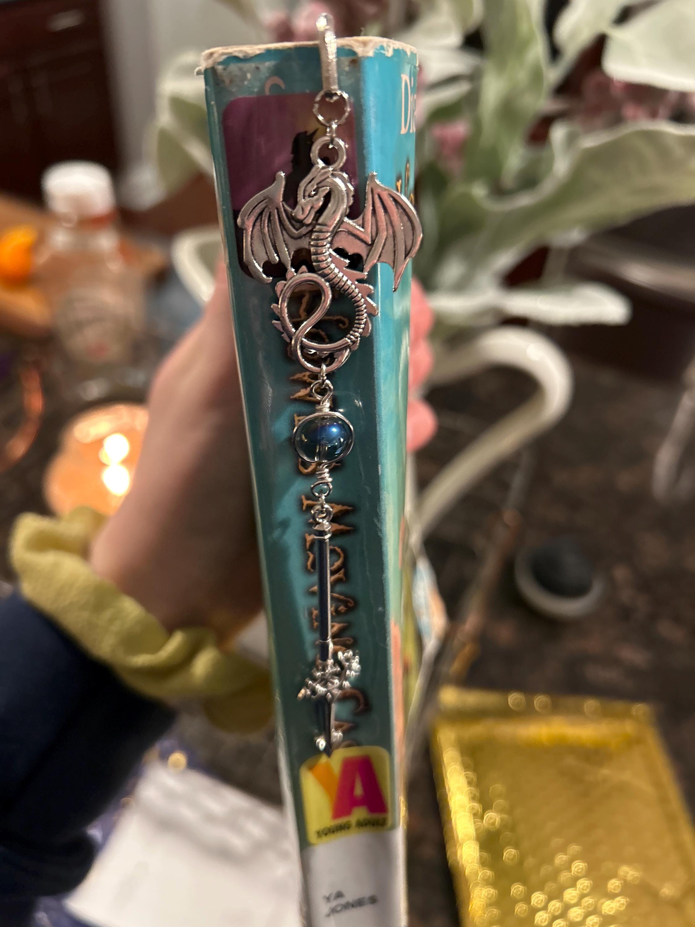 Hook the wire inside your book to hold your page and the dragon design will hang on the outside of your book.