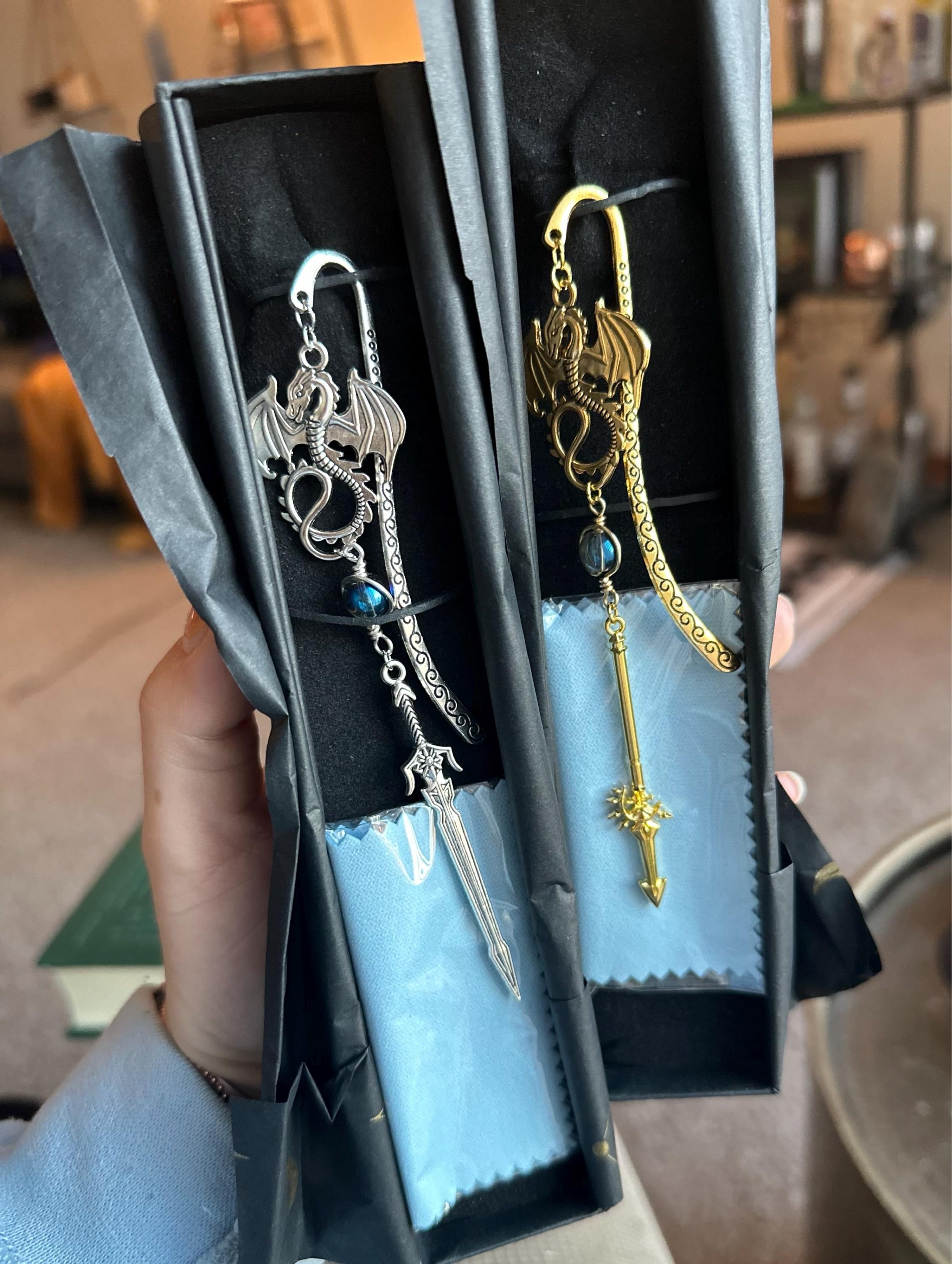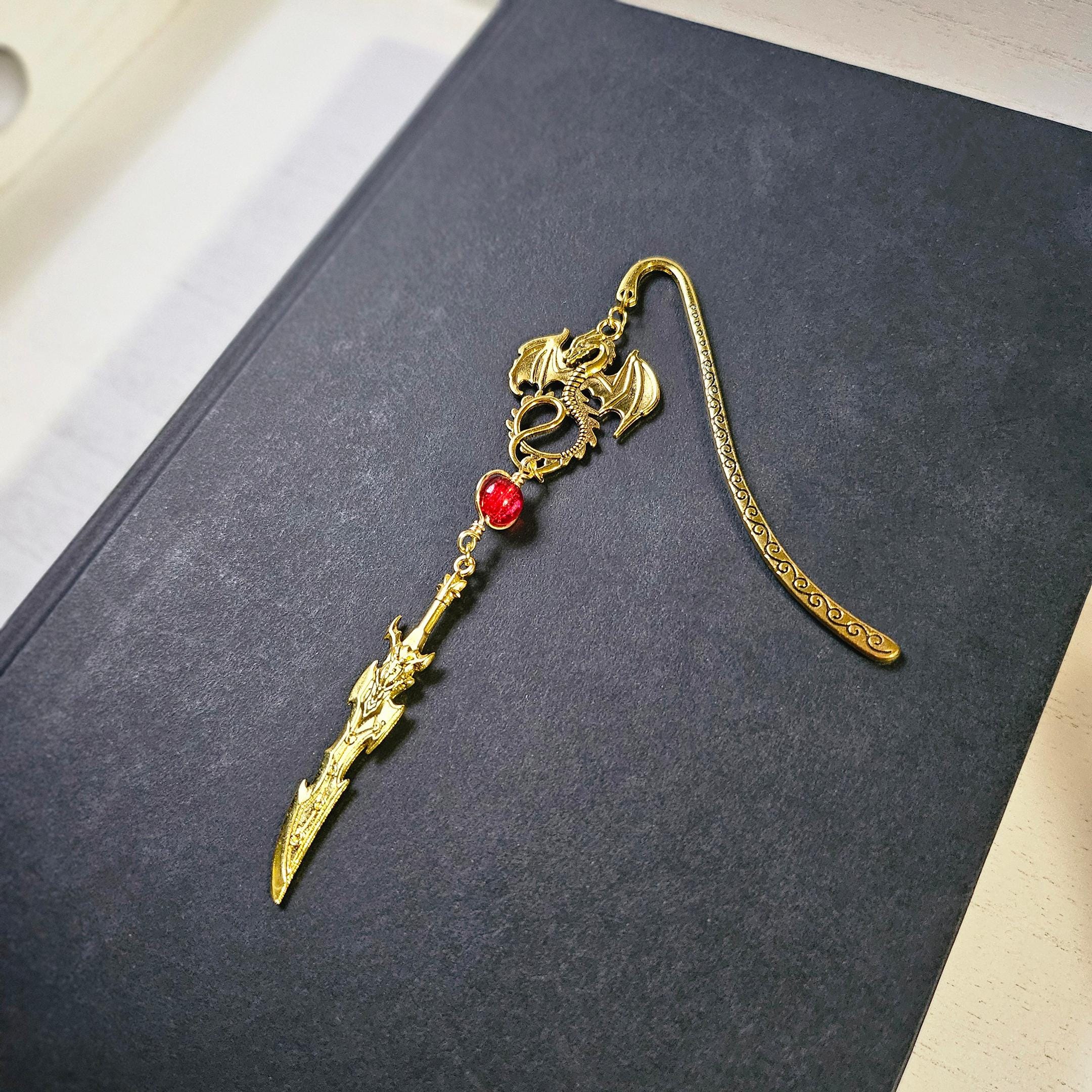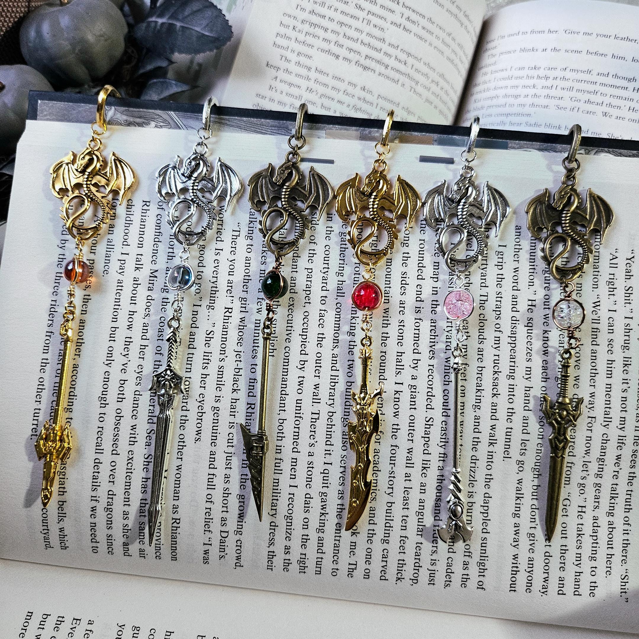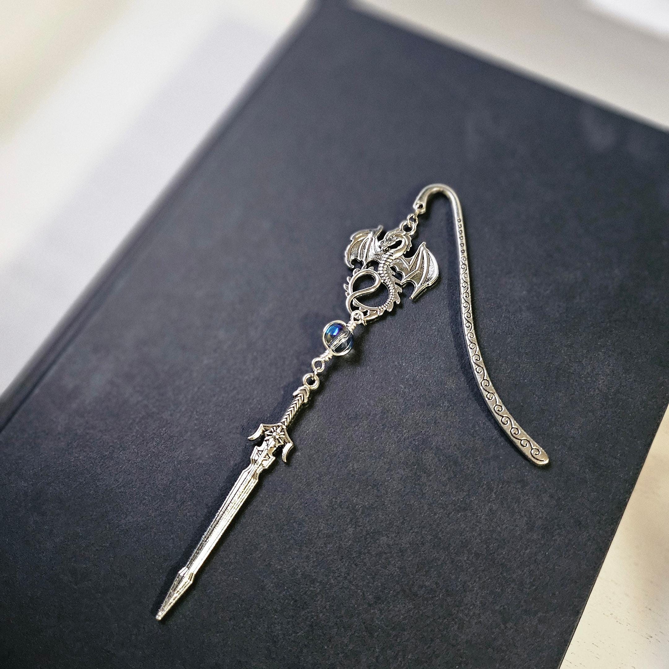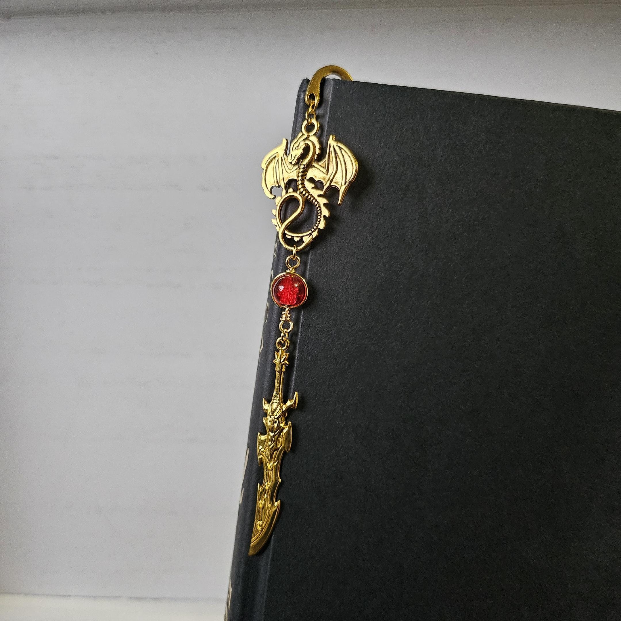 Hook the wire inside your book to hold your page and the dragon design will hang on the outside of your book.