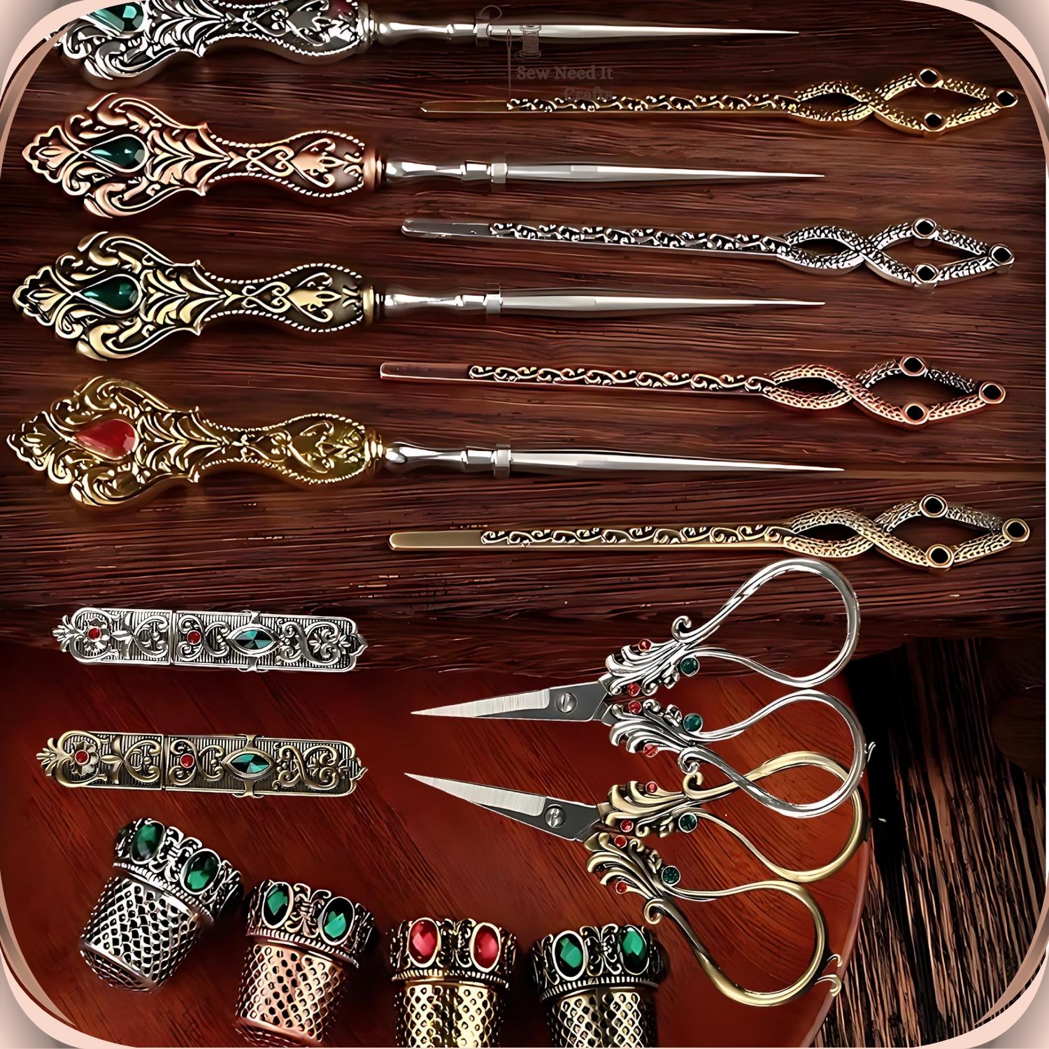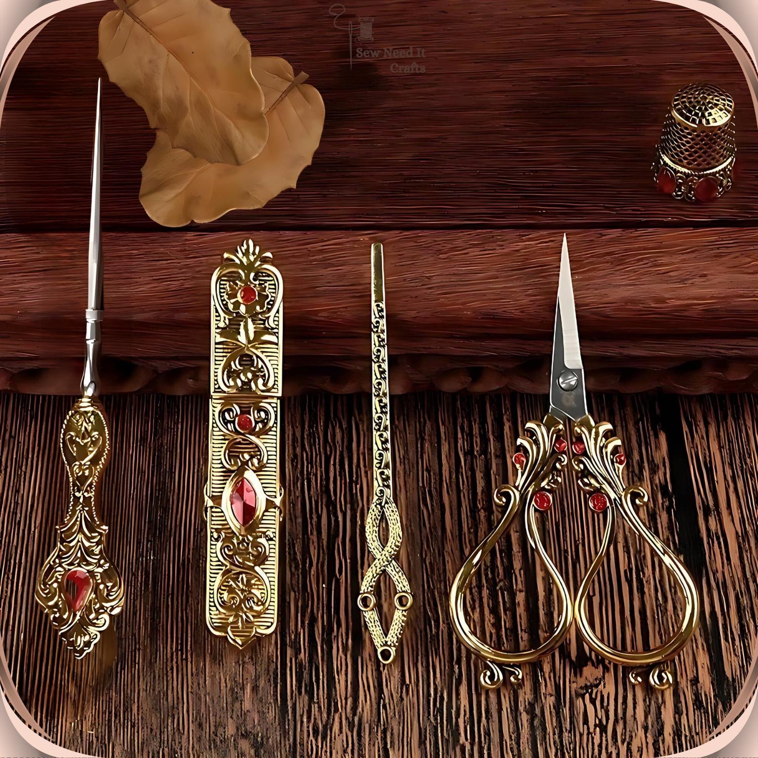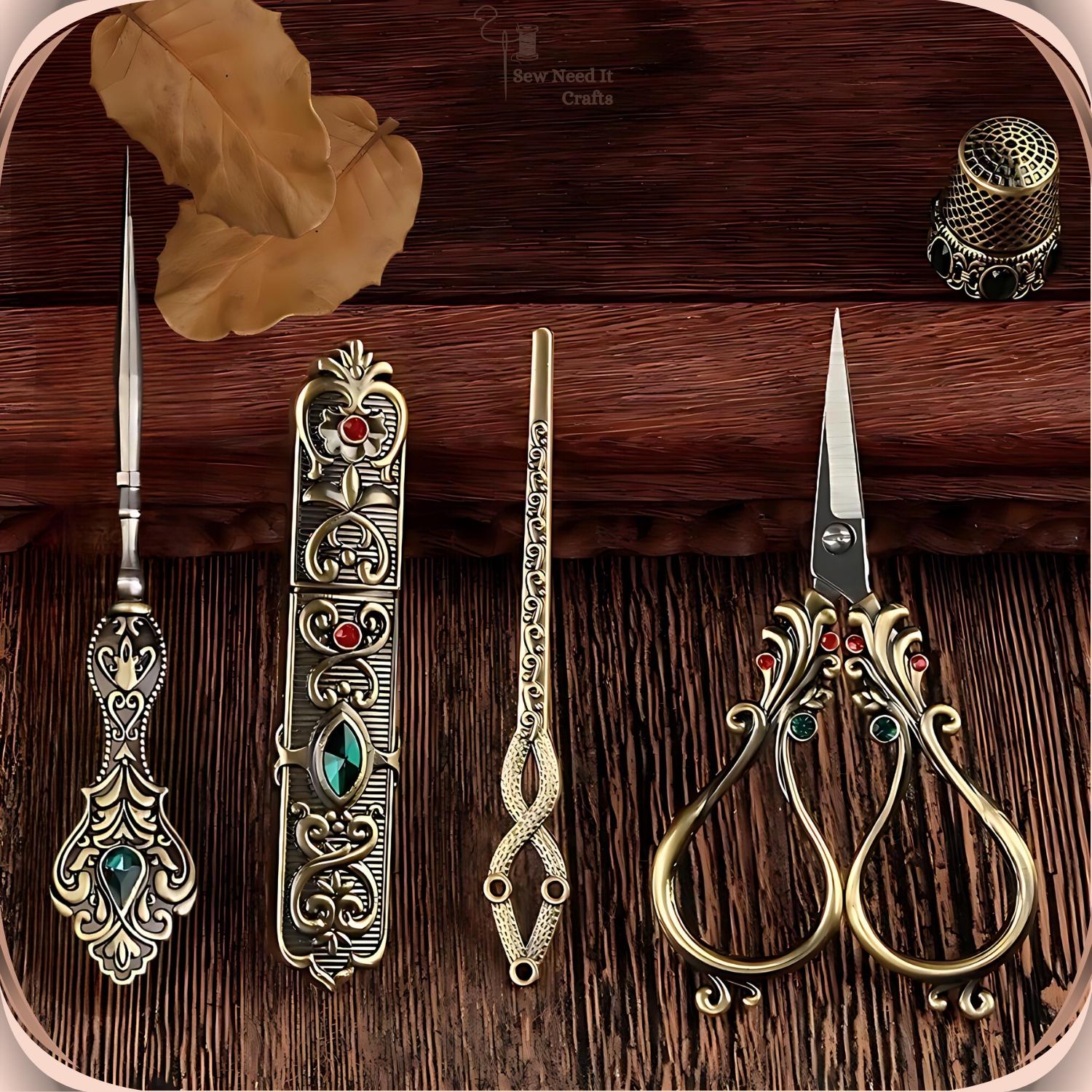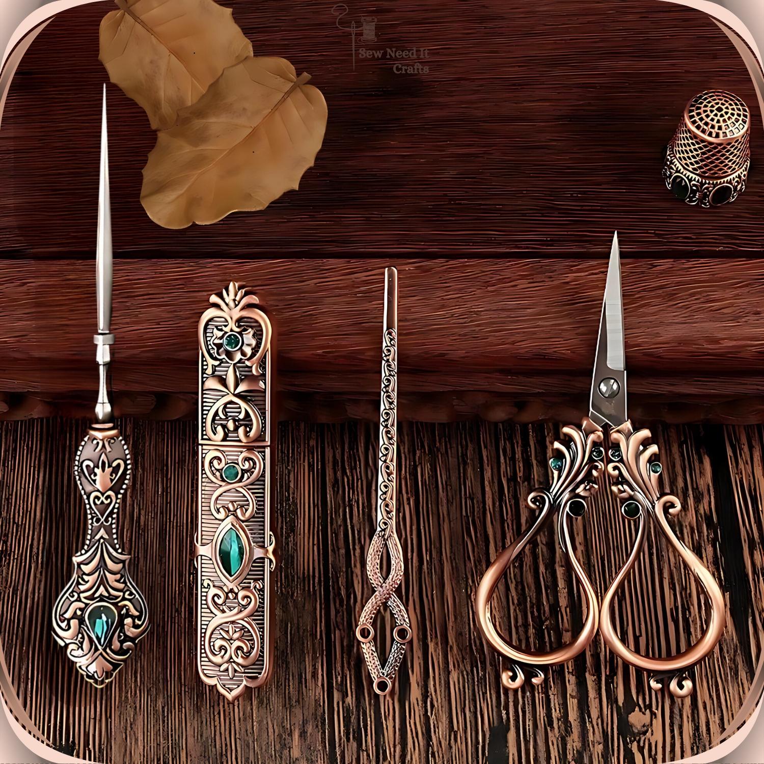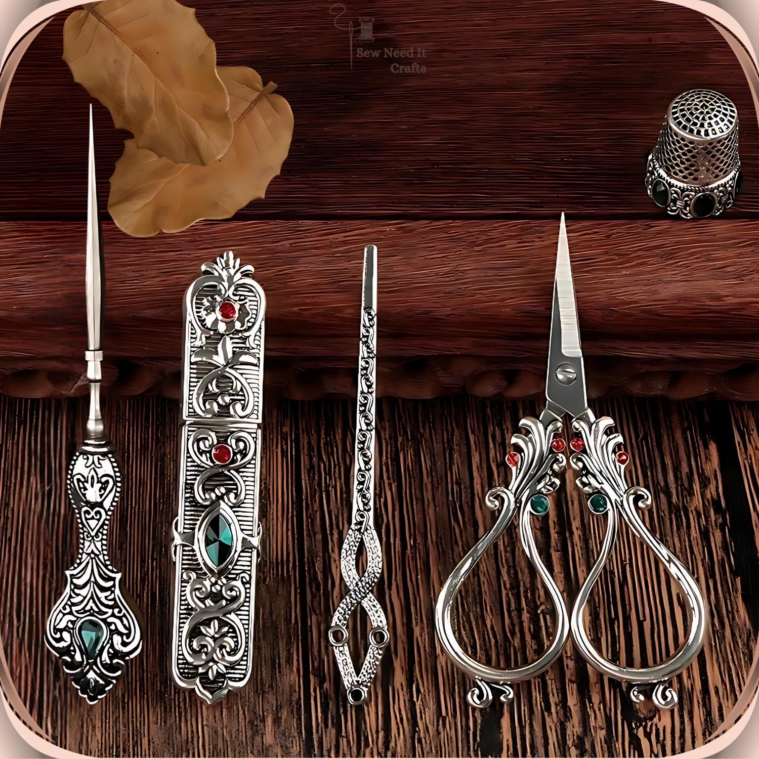 Elevate your sewing experience with our exquisite Elegant Metal Engraved Antique & Vintage Style Complete Sewing Set. This premium set includes high-quality scissors, a needle holder case, a thimble, an awl, and a threading needle, all crafted with meticulous attention to detail.