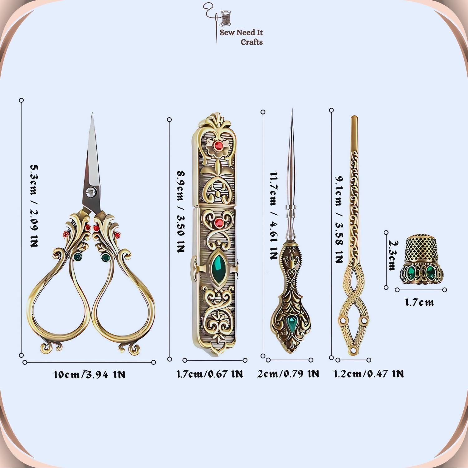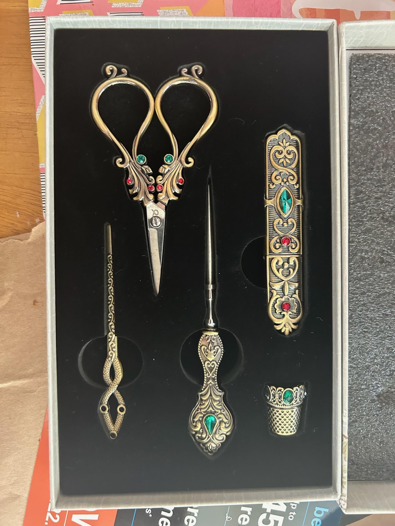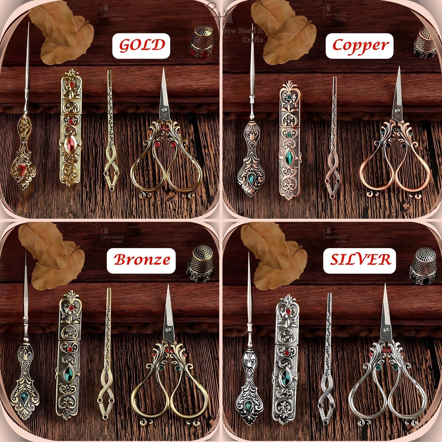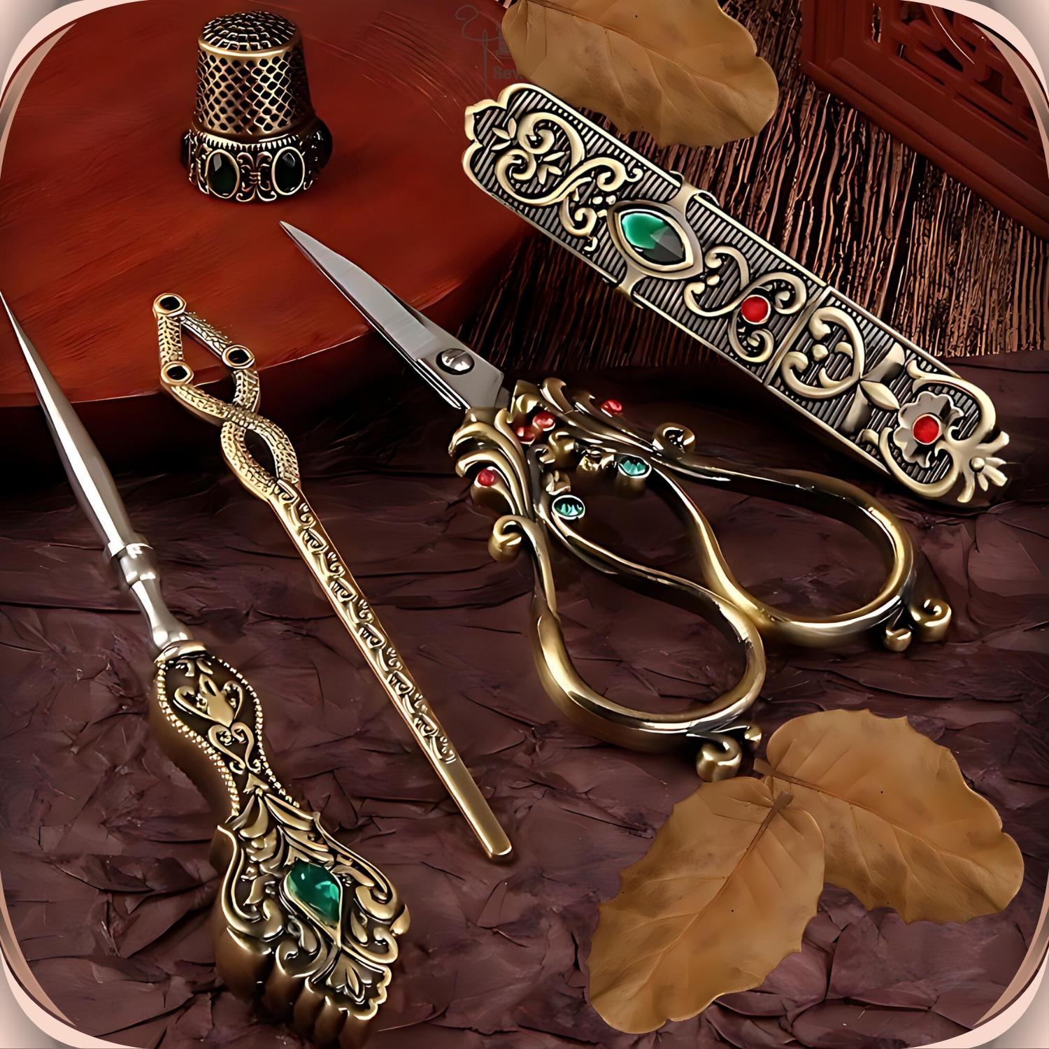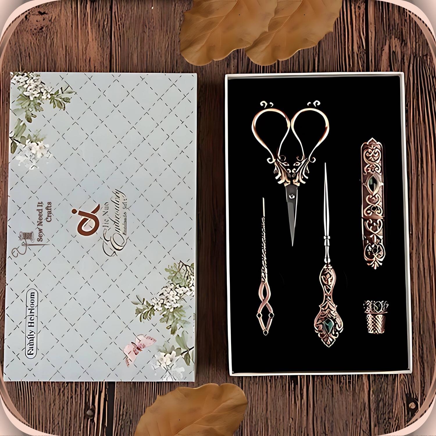 Elevate your sewing experience with our exquisite Elegant Metal Engraved Antique & Vintage Style Complete Sewing Set. This premium set includes high-quality scissors, a needle holder case, a thimble, an awl, and a threading needle, all crafted with meticulous attention to detail.