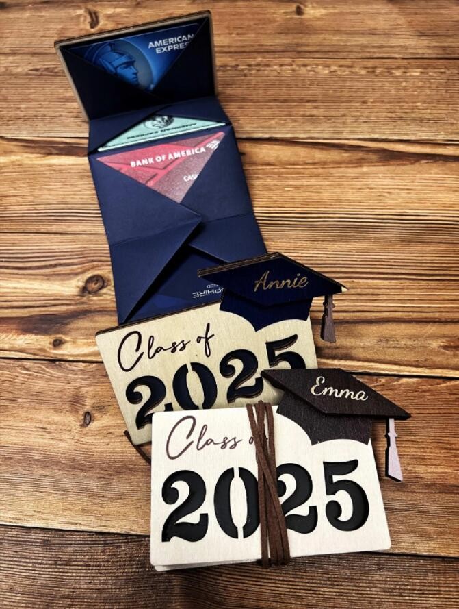 Give your graduate a cool gift card holder! This is a unique, personalized gift with hand-folded card pages. Holder contains 10 gift cards.