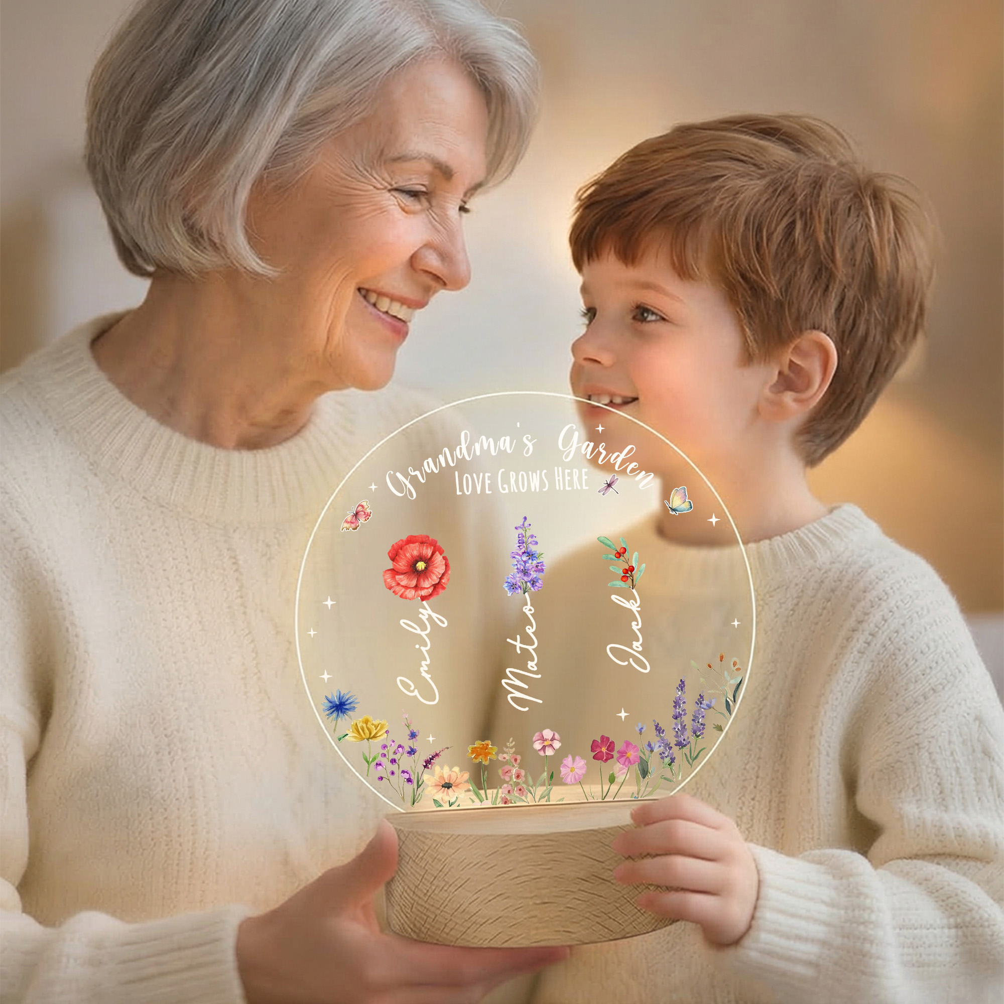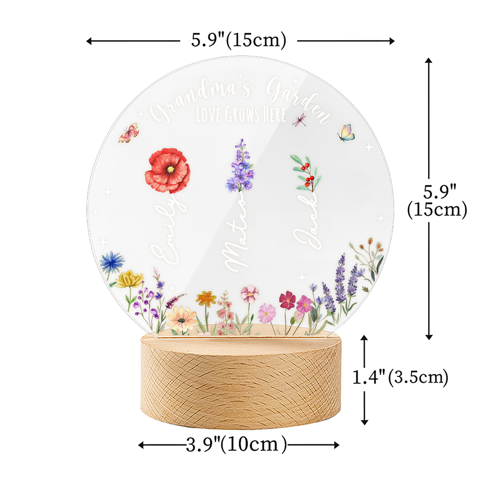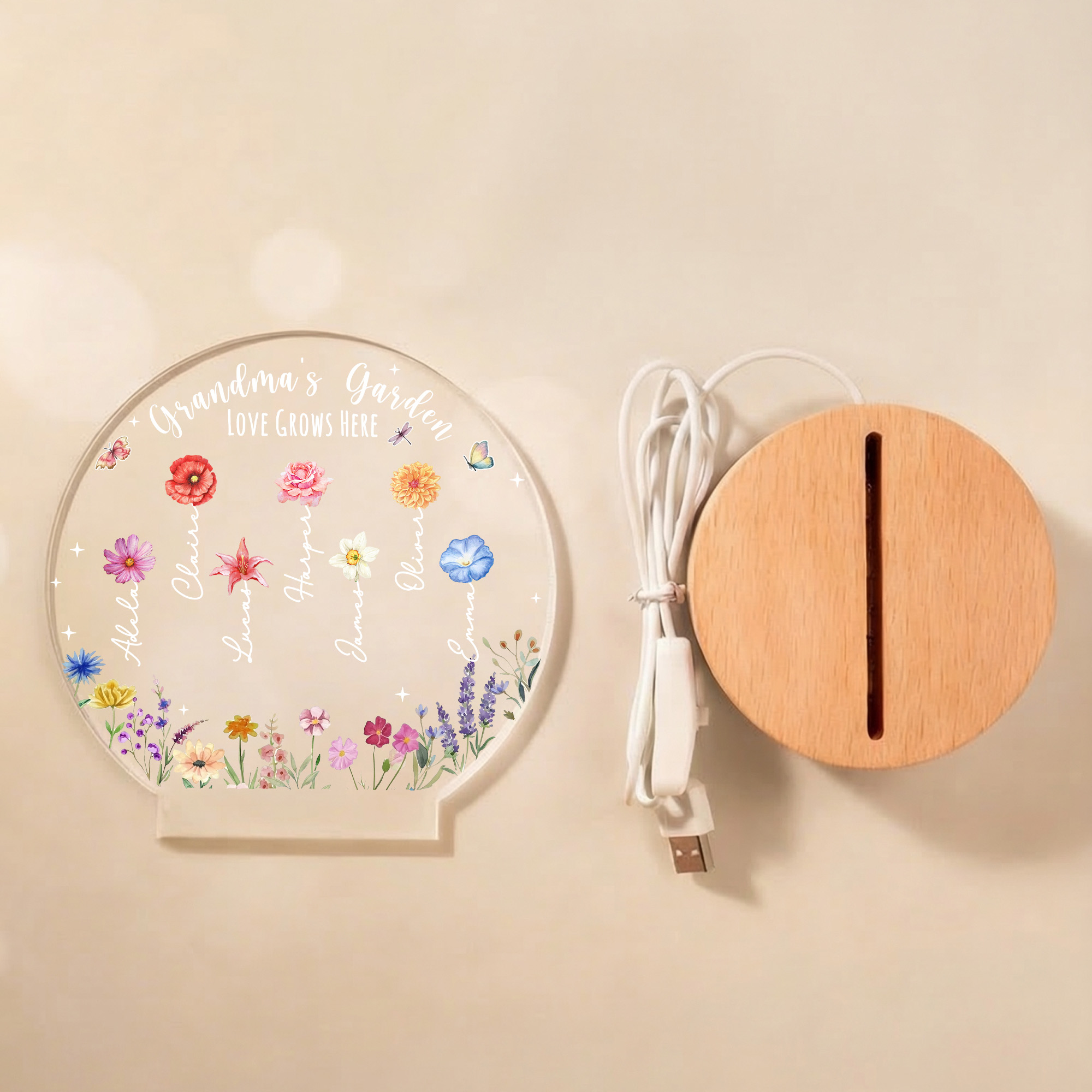 Grandma’s Garden Design - This LED night light features a heartwarming “Grandma’s Garden” theme, with delicate birth flowers arranged in a soft, glowing display. The clear acrylic panel and warm light create a cozy and meaningful accent for any room.