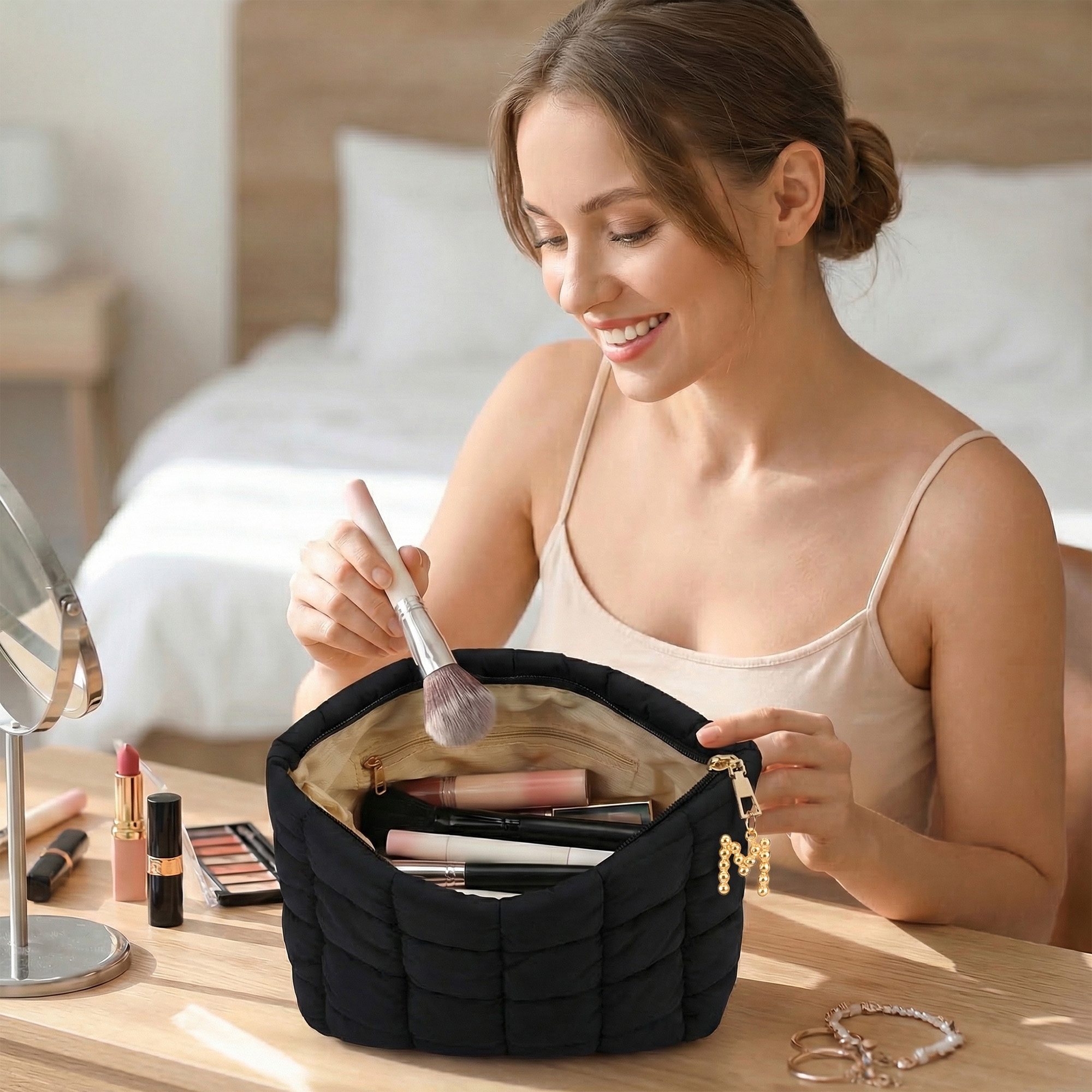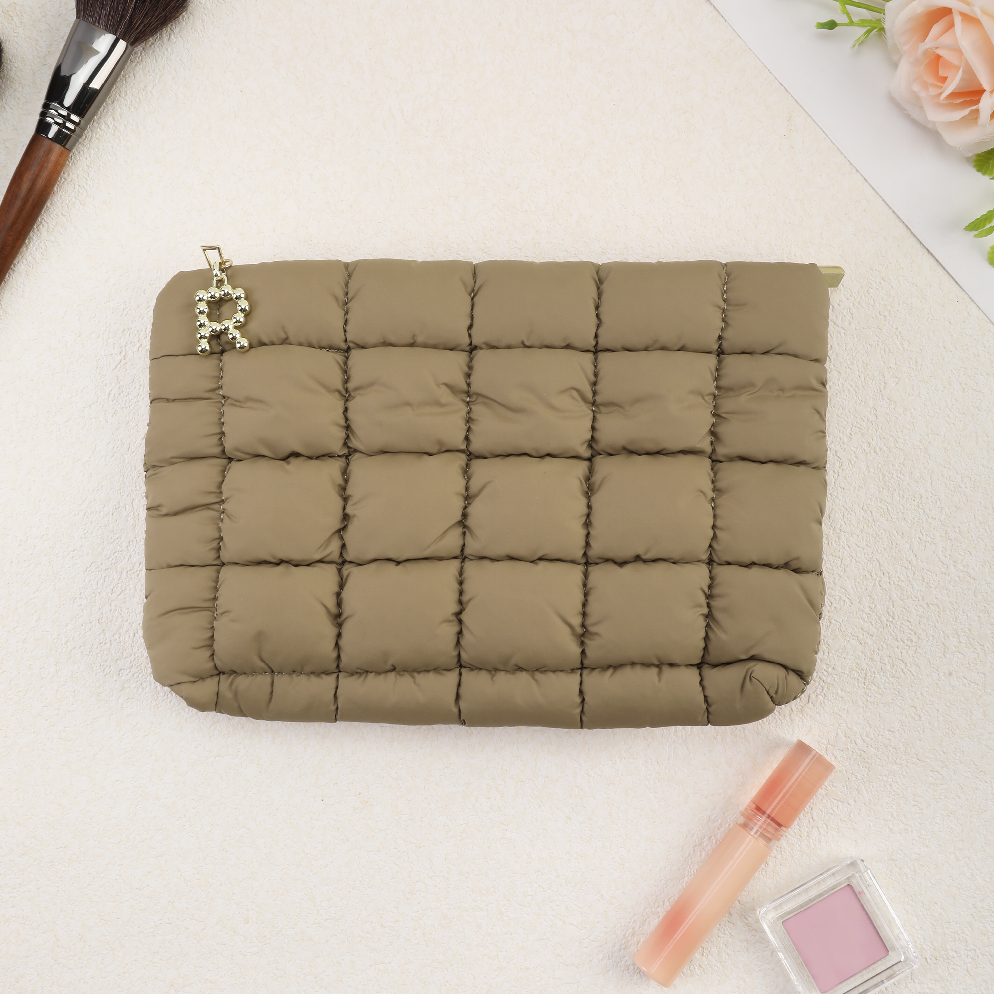 Personalized Initial Detail - Add a personal touch with a custom initial displayed on the zipper charm. This simple but meaningful detail turns an everyday makeup pouch into something special. It helps identify your bag easily and gives it a one-of-a-kind feel that reflects your style.