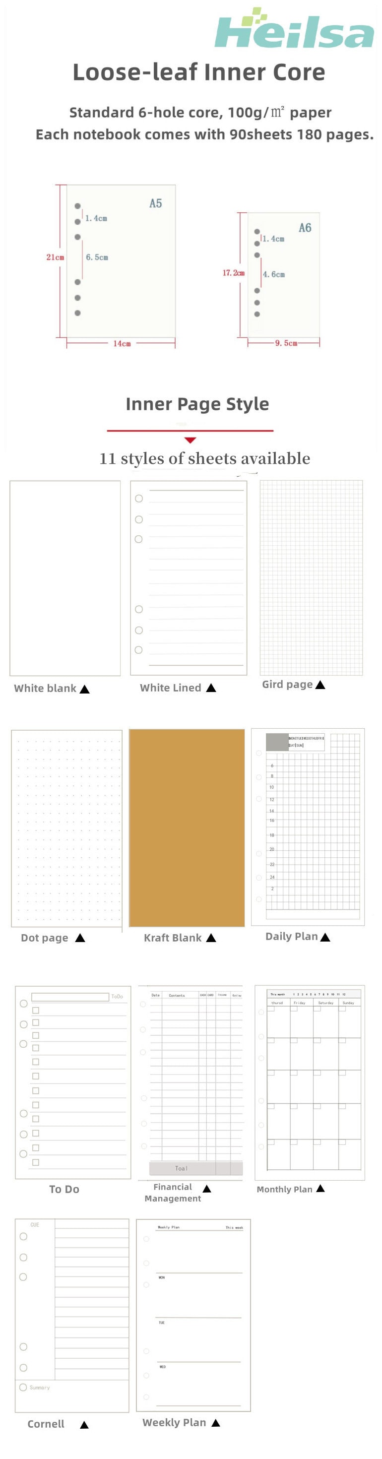 Inner pages/inserts: 100g/㎡ beige quality paper, 90 sheets 180 pages. There are 11 styles of inner pages to choose from, white blank pages, white lined pages, white grid pages, white dotted pages, kraft blank pages, daily planner, weekly planner, monthly planner, to-do page, Cornell page and financial management page. You can choose each style you like. (If you need two styles of inner pages, please leave a message, such as blank pages and lined pages.)