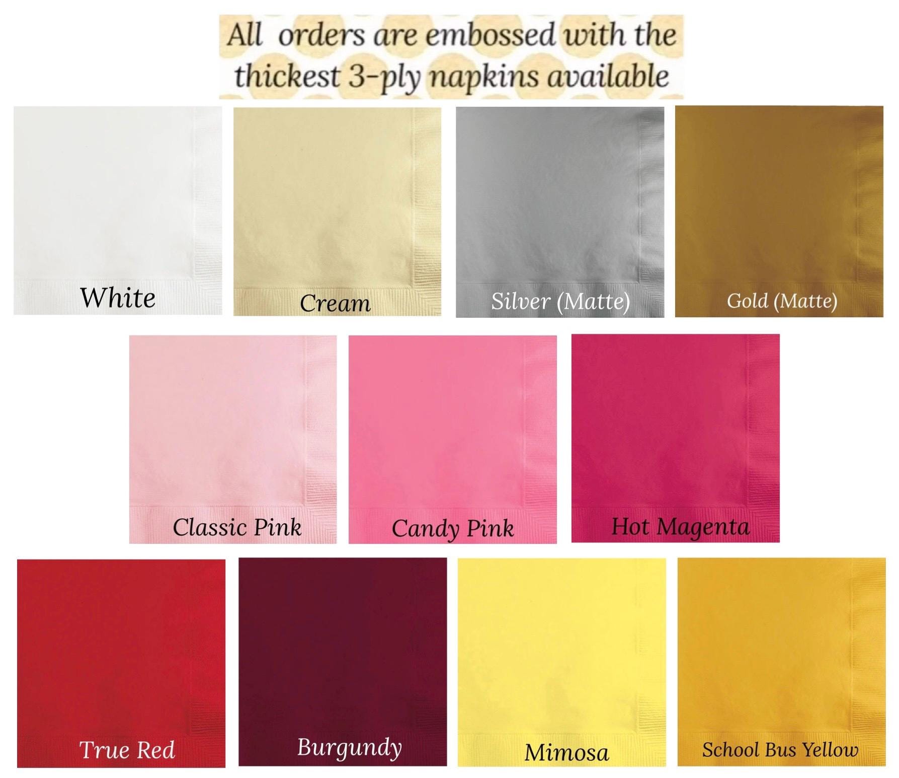 See the additional photos included with each item for available colors. However, please note that the color of the napkins may vary due to differences in computer monitors and lighting. Also, if you order different sizes of napkins in the same color family (e.g. lunch, cocktail, and guest towels), I will do my best to accommodate your needs, but dye lots of different sizes may not be a perfect match. Also, cream napkins may have a yellowish tint depending on the dye lot, while white napkins are more of a warm white.