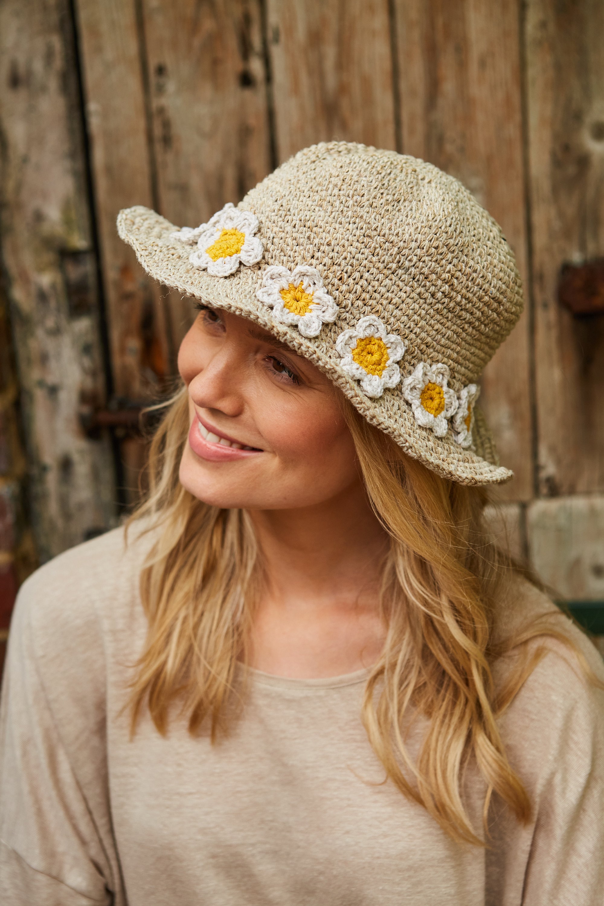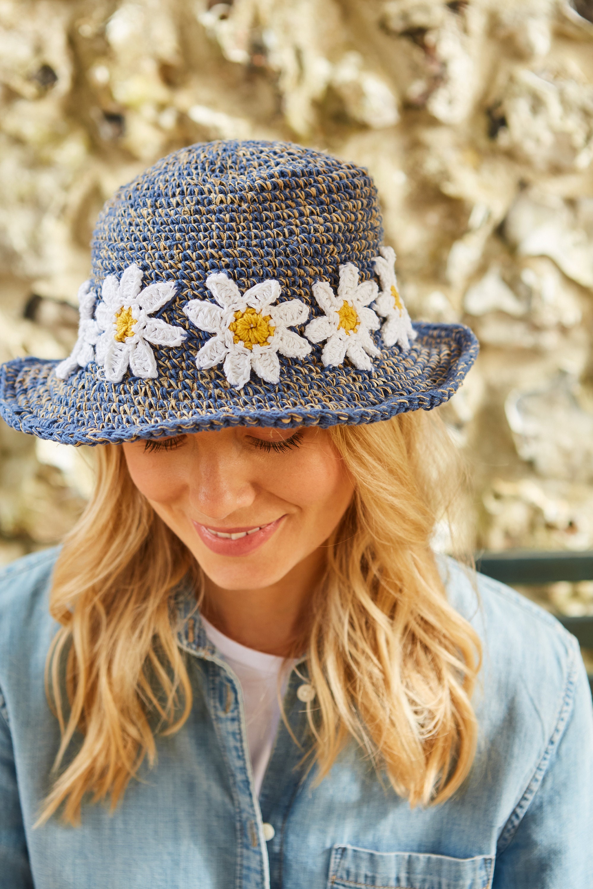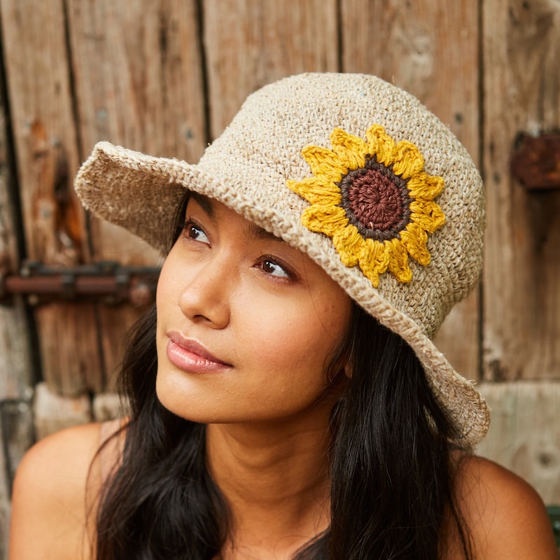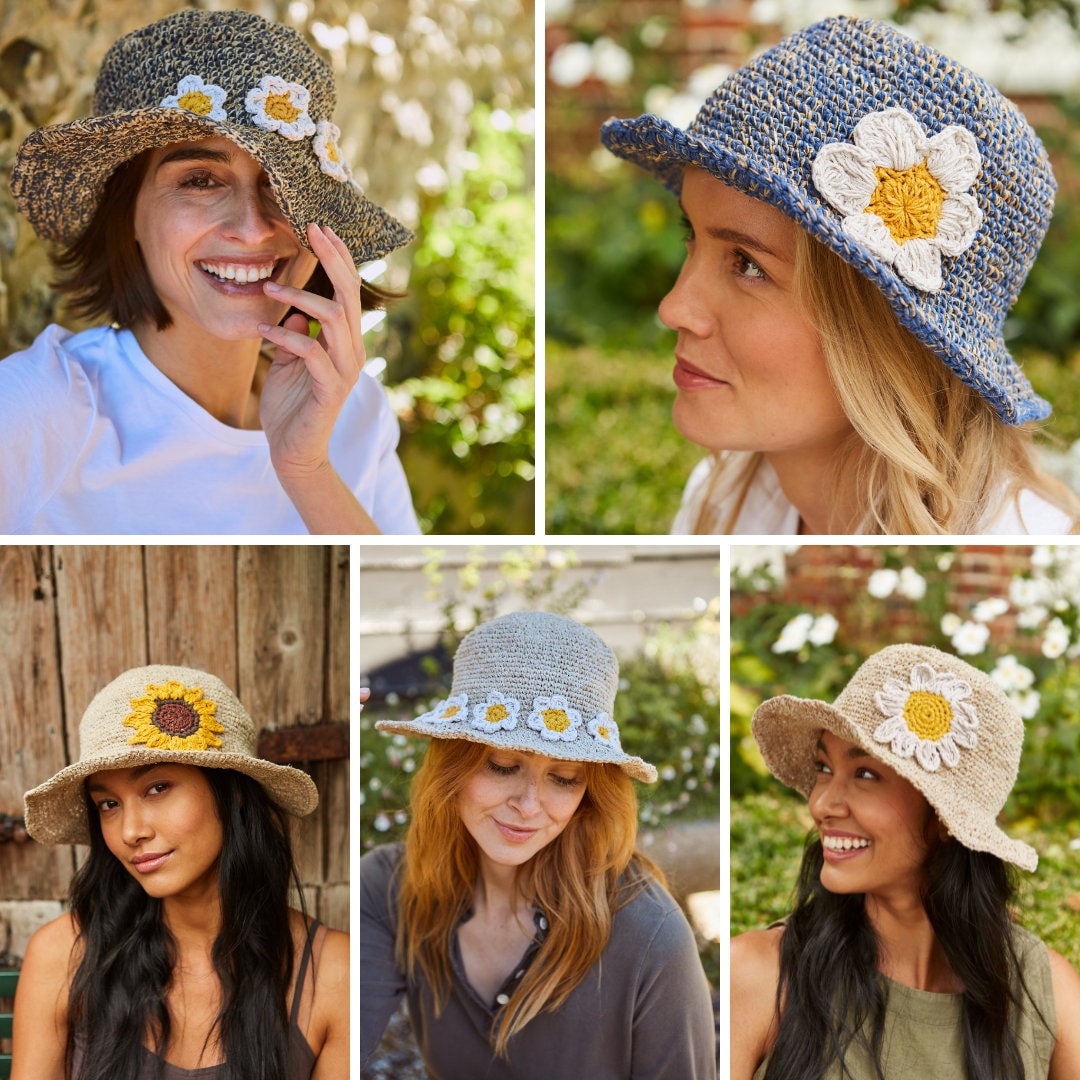 Wear our Fairtrade hemp rope hat in style and on the go. Made from sustainable hemp and cotton rope with an adjustable wire trim, this crochet sun hat for women is perfect for festive fashion. Stylishly protect yourself from the sun at the beach or poolside! Available in denim or natural with a daisy, daisy chain or sunflower pattern, it makes an ethical gift that supports fair trade and slow fashion.
