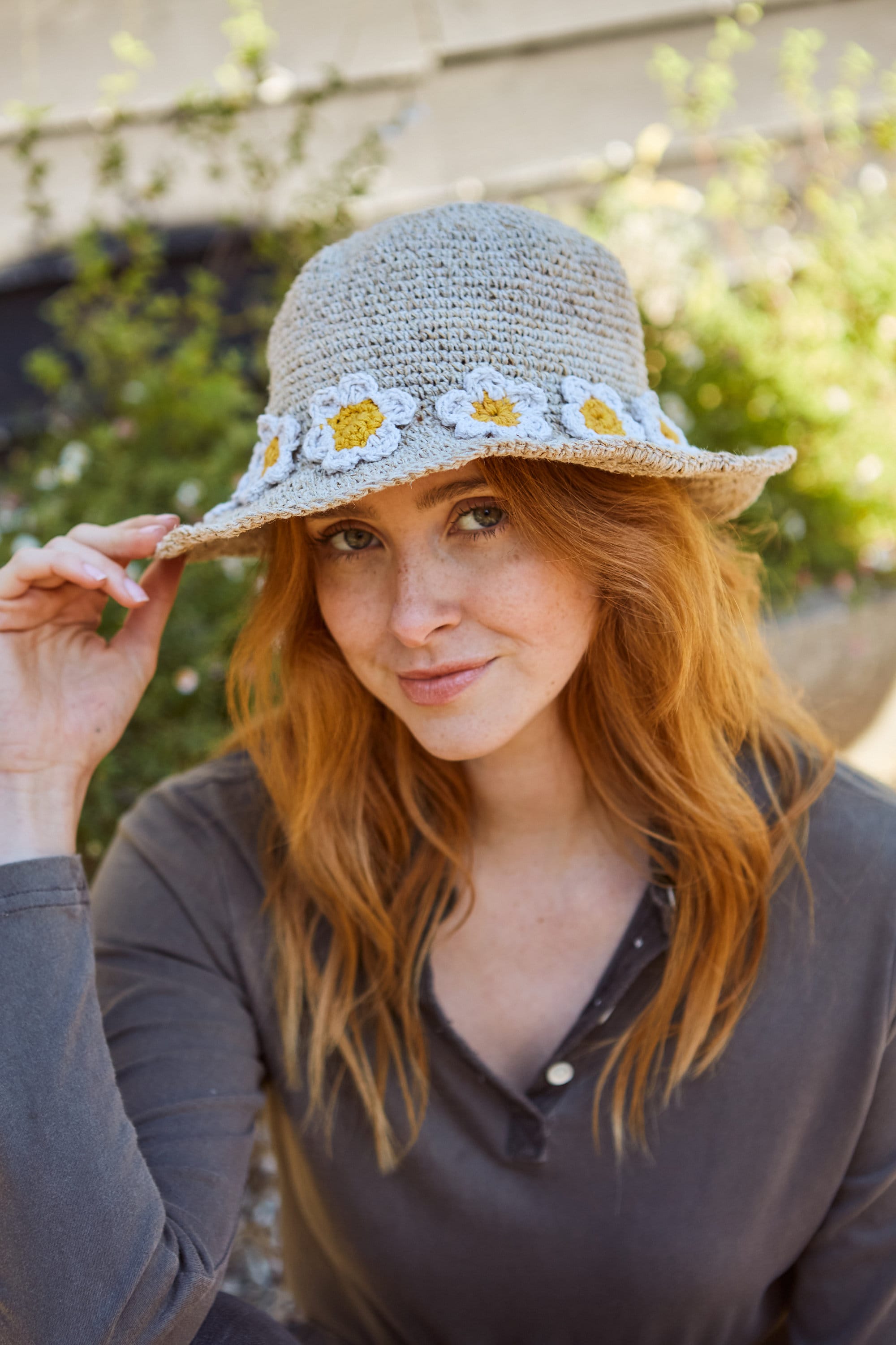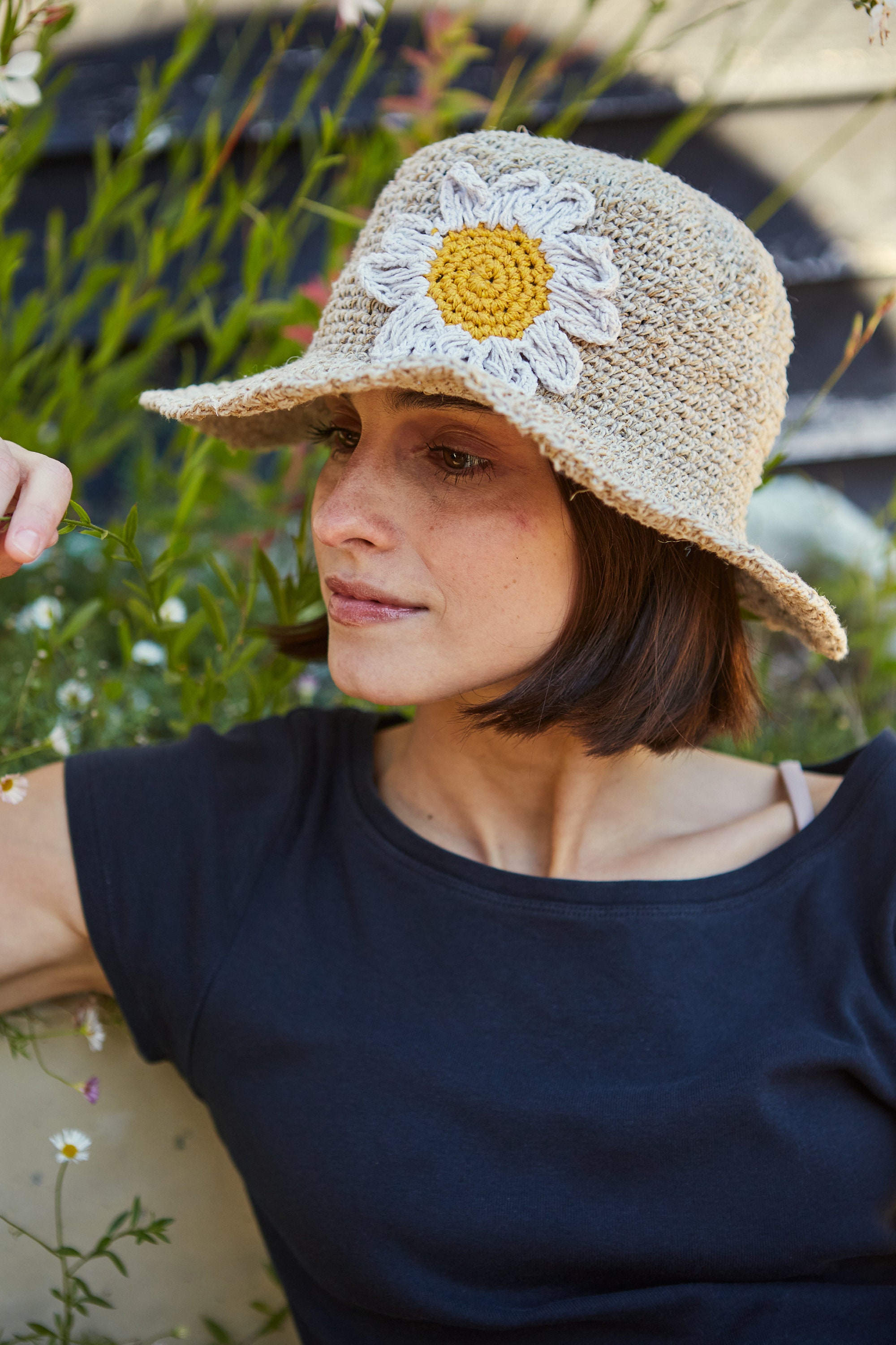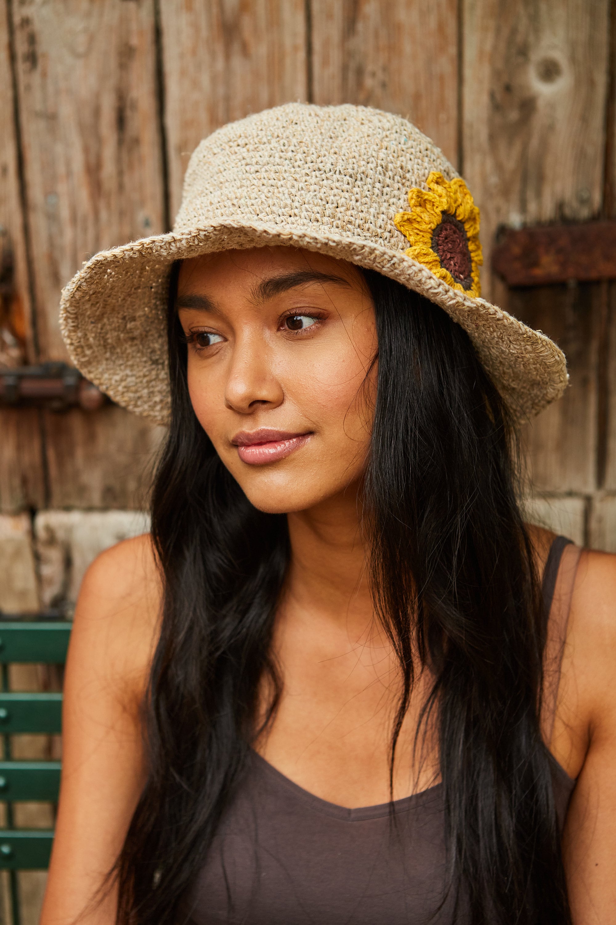 Wear our Fairtrade hemp rope hat in style and on the go. Made from sustainable hemp and cotton rope with an adjustable wire trim, this crochet sun hat for women is perfect for festive fashion. Stylishly protect yourself from the sun at the beach or poolside! Available in denim or natural with a daisy, daisy chain or sunflower pattern, it makes an ethical gift that supports fair trade and slow fashion.