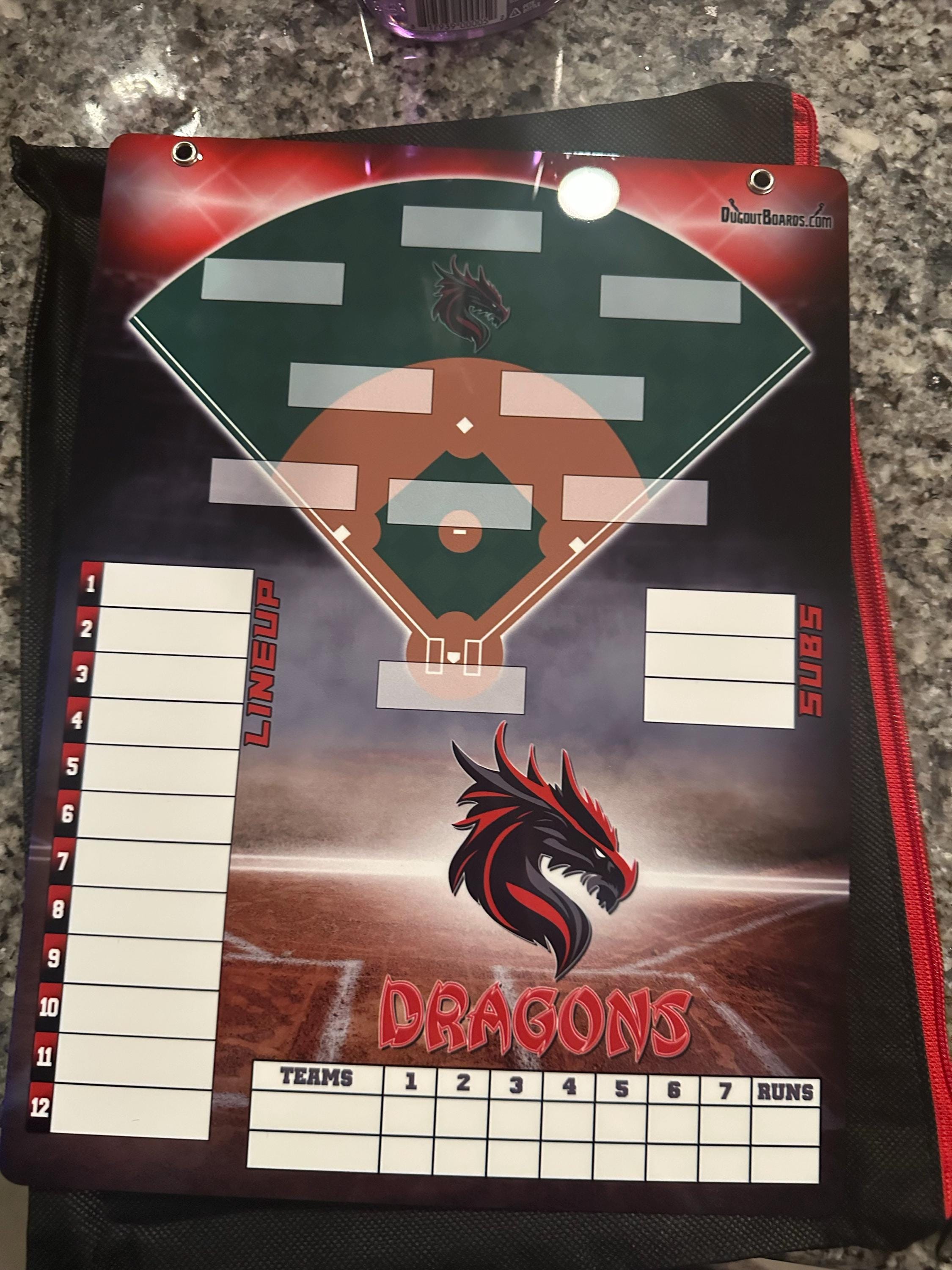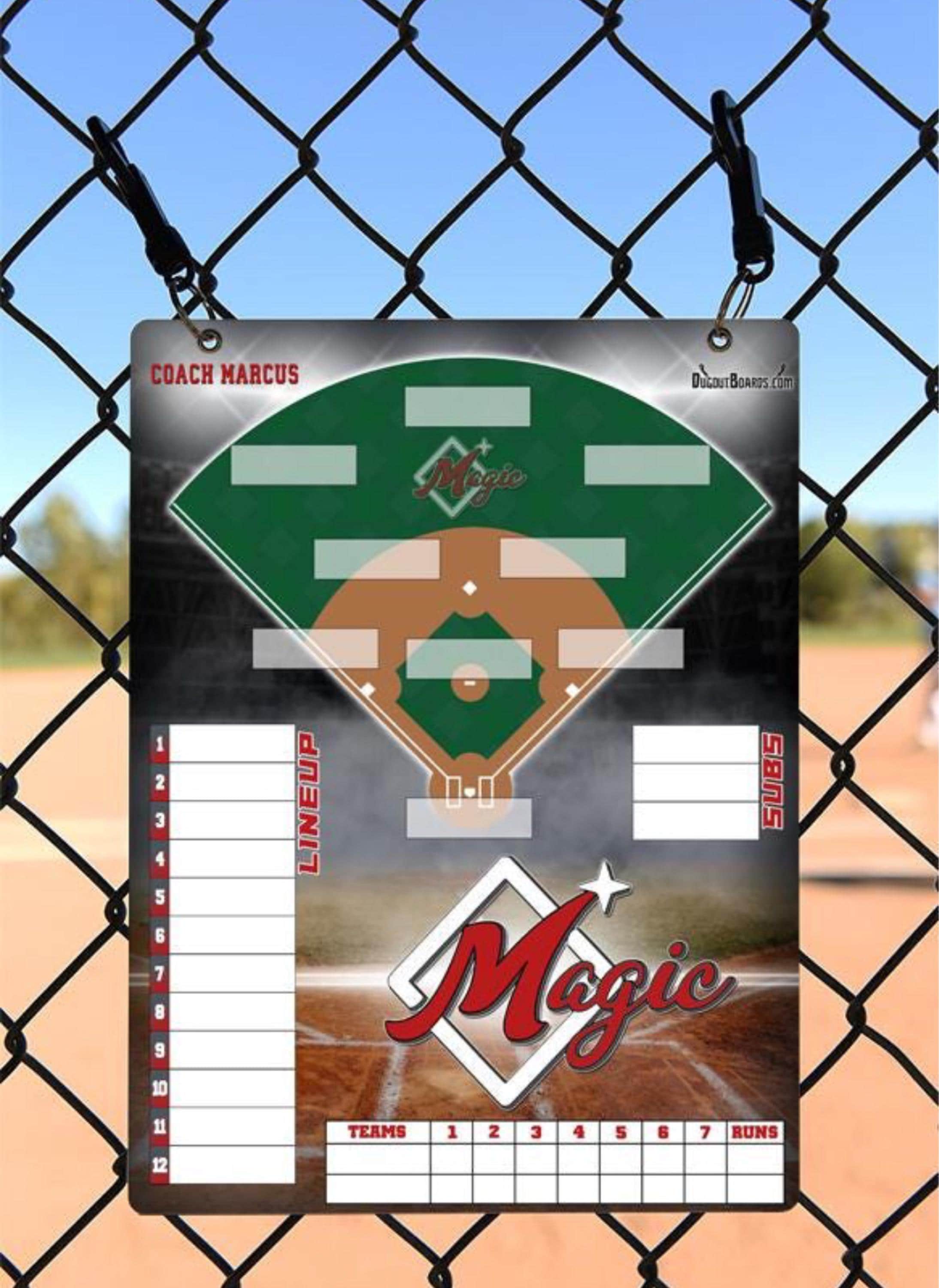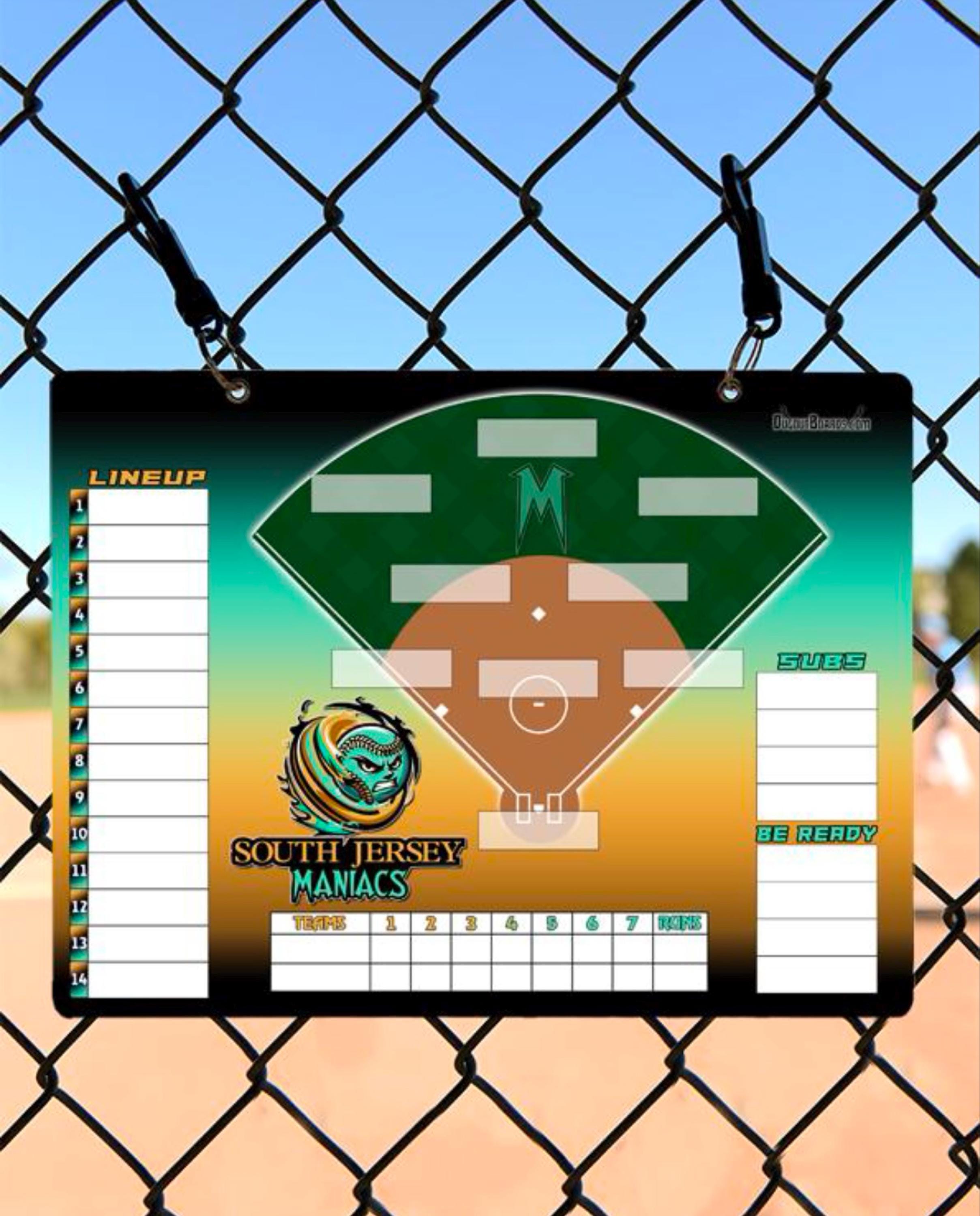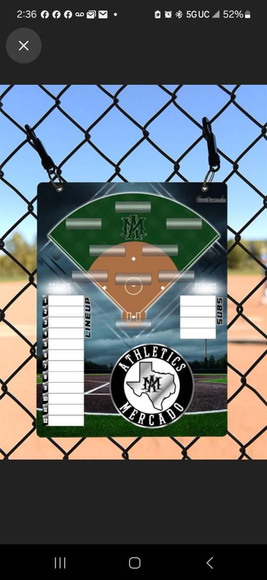 I will create a custom lineup board using your team's colors and logo. You can also add a team photo to the board if you wish.